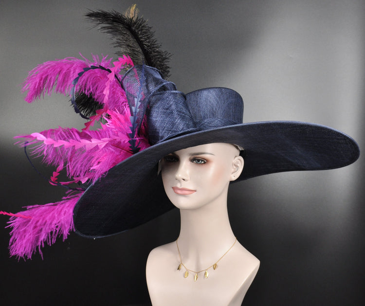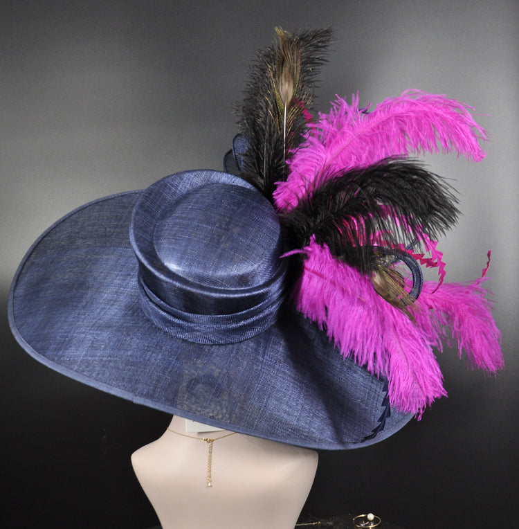 Navy Blue Feather Flower Peacock Royal Ascot, Oaks day hat, Carriage, Tea Party ,Wedding, Kentucky Derby Hat Party Hat Ostrich Feather