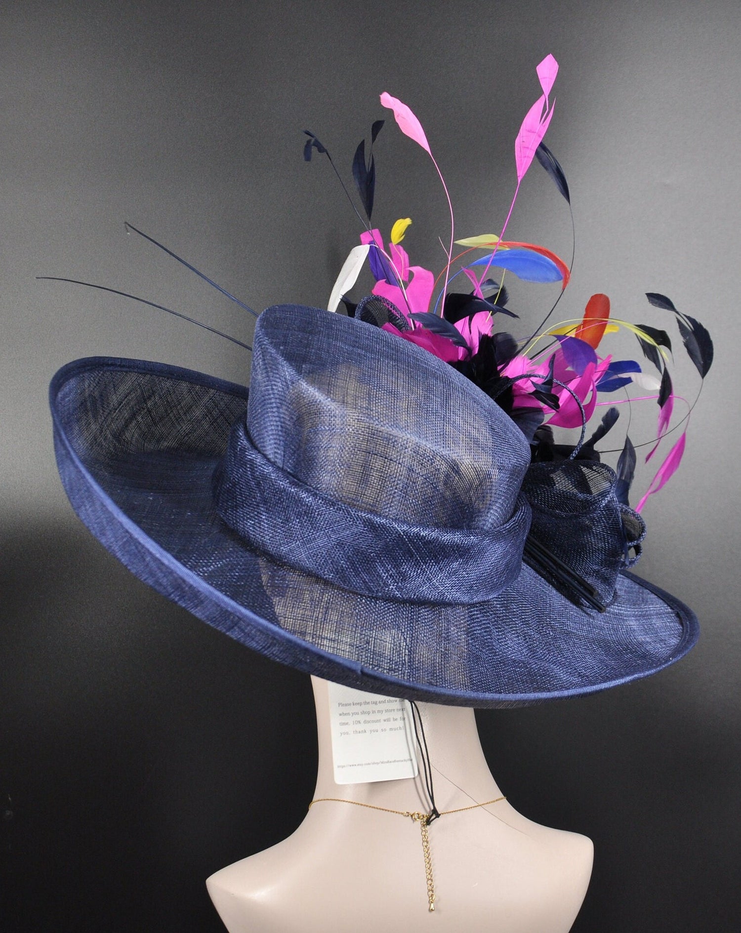 Navy Blue Sinamay Derby Hat: Fuchsia Feather Flower, Wide Brim