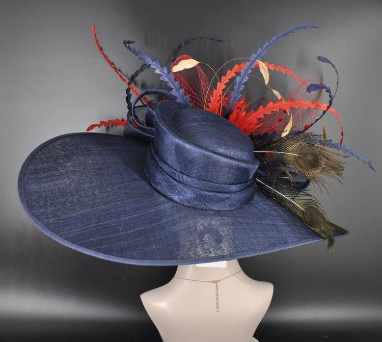 Navy Blue Sinamay Derby Hat: Red Feather Ascot Race Day Hat