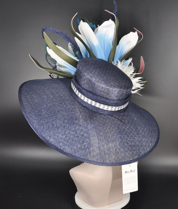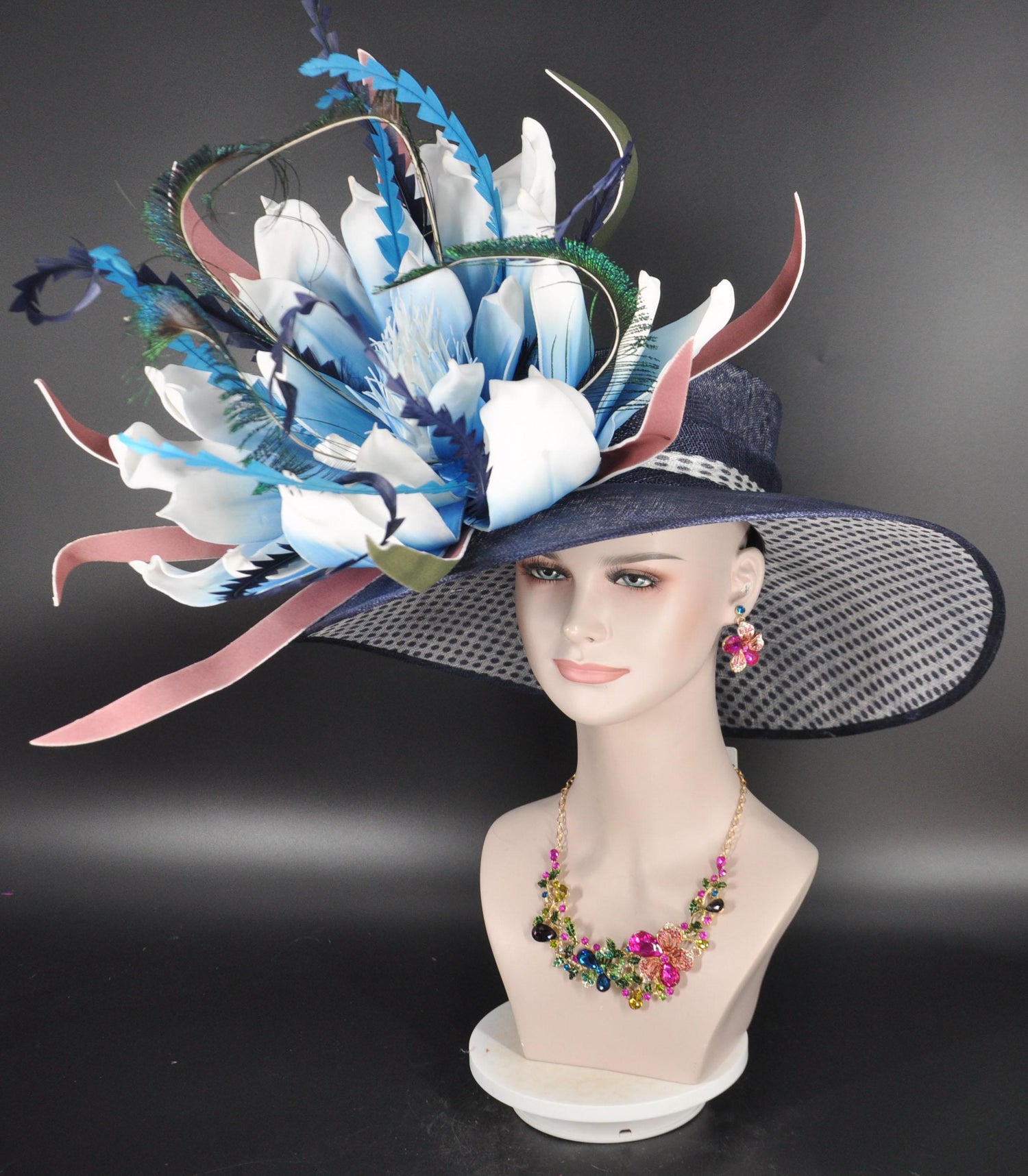Have questions? Feel free to reach out—we’re happy to help!This sinamay hat is an extravagant and elegant statement piece, perfect for an event like the Kentucky Derby. The base of the hat is a blue, structured with a wide brim that provides a classic and sophisticated silhouette.