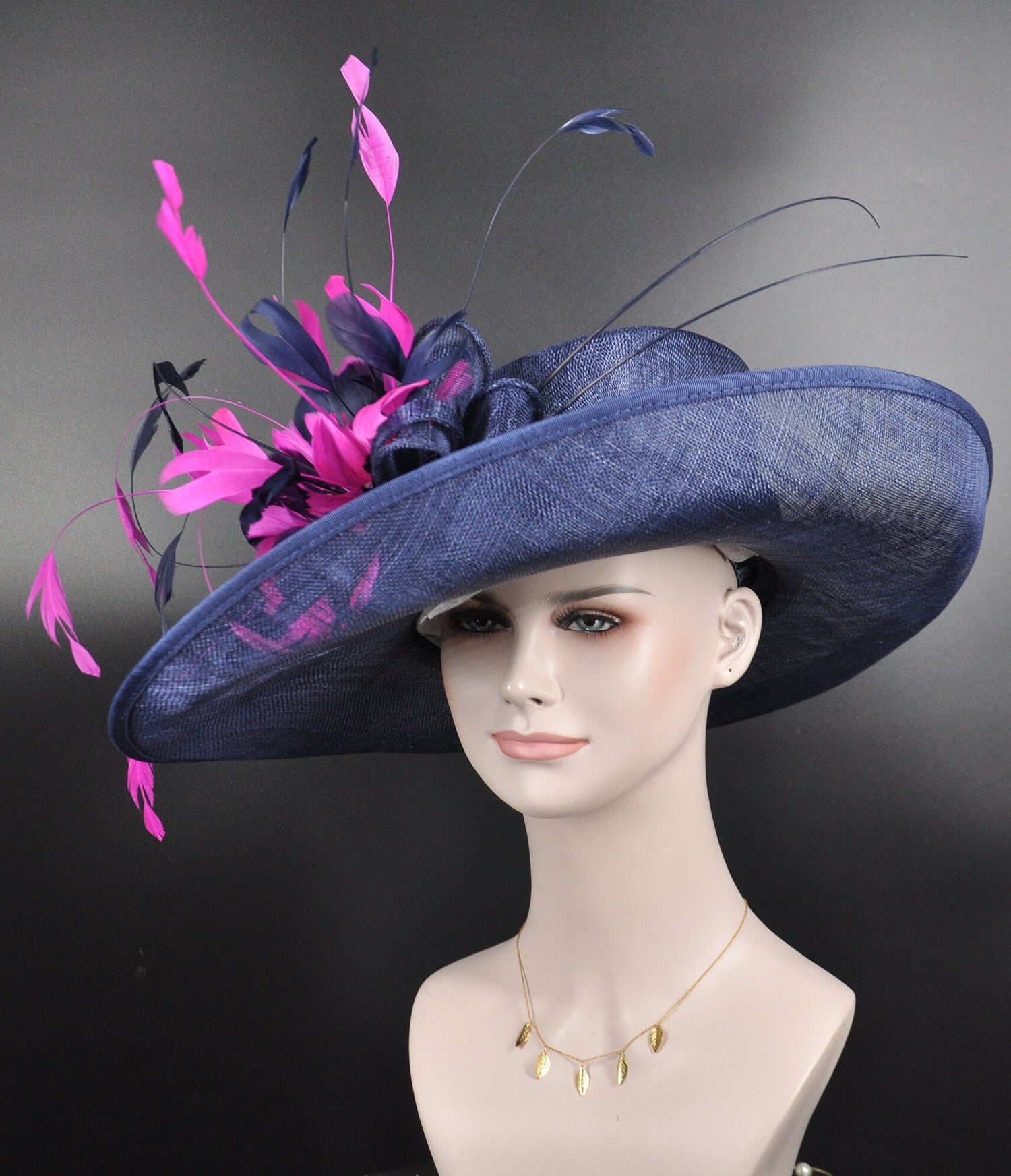 Navy Blue Sinamay Kentucky Derby Hat: Fuchsia Feather Flower Wide Brim