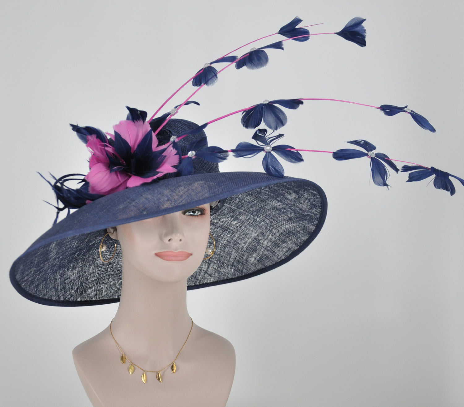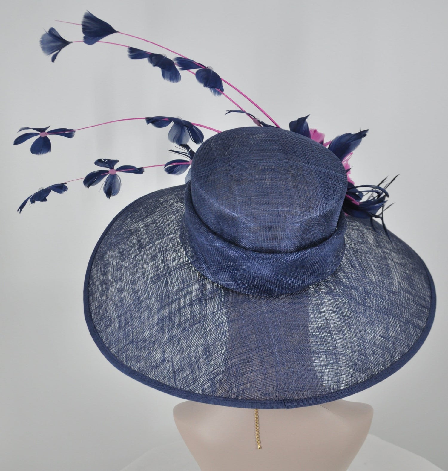 Navy Blue Sinamay Kentucky Derby Hat: Hot Pink Feather Flowers