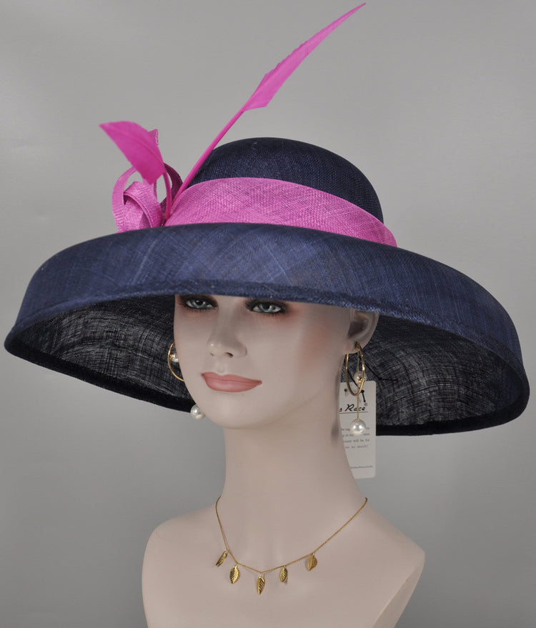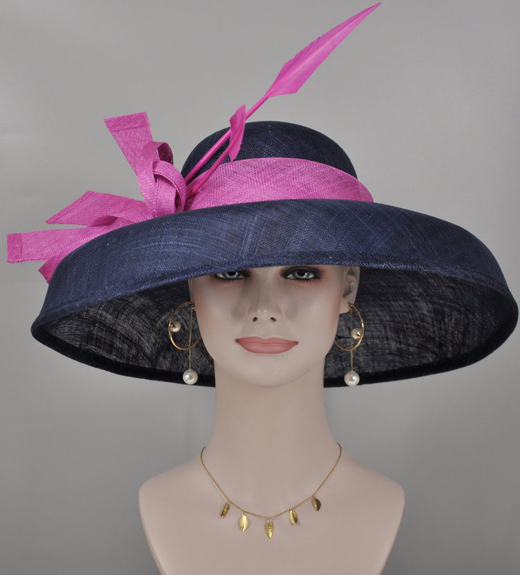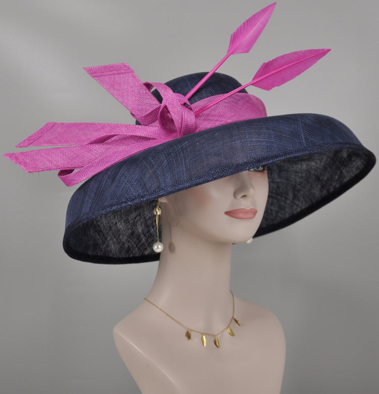 Navy Blue Sinamay Kentucky Derby Hat: Hot Pink Feathered Wide Brim