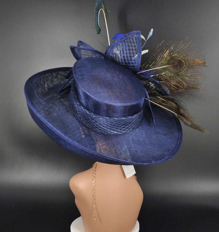 Navy Blue Sinamay Kentucky Derby Hat: Wide Brim Feathered Church Hat