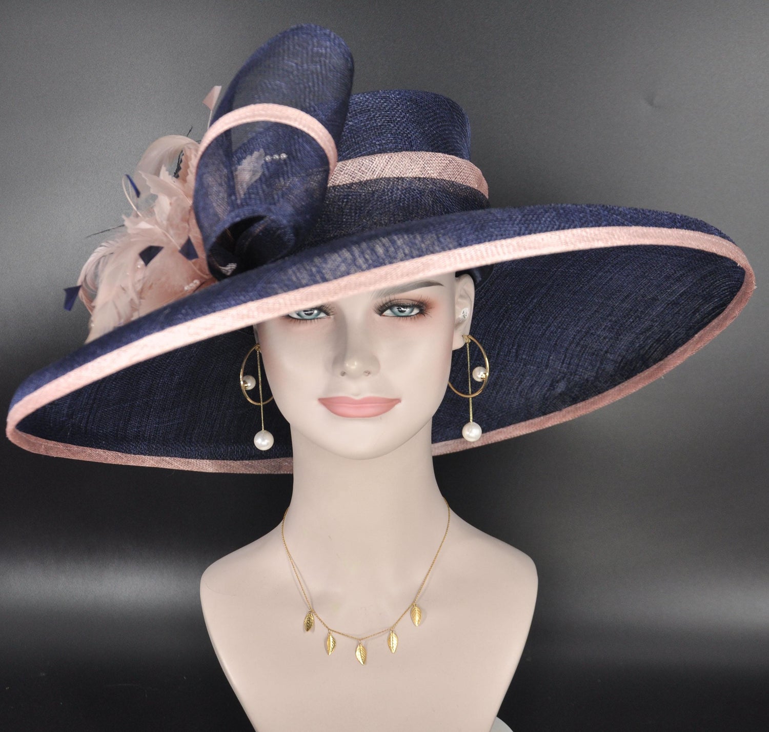 Navy Blue w Blush/Dusty Pink Feather Hat, Kentucky Derby, Tea Party, Wedding, Church, Royal Ascot Wide Brim Sinamay Hat Oaks Day Hat