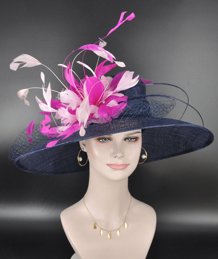 Navy Blue w Fuchsia Pink Baby Pink Feather Flower Kentucky Derby Hat Tea Party Carriage Party Wide Brim Sinamay Hat
