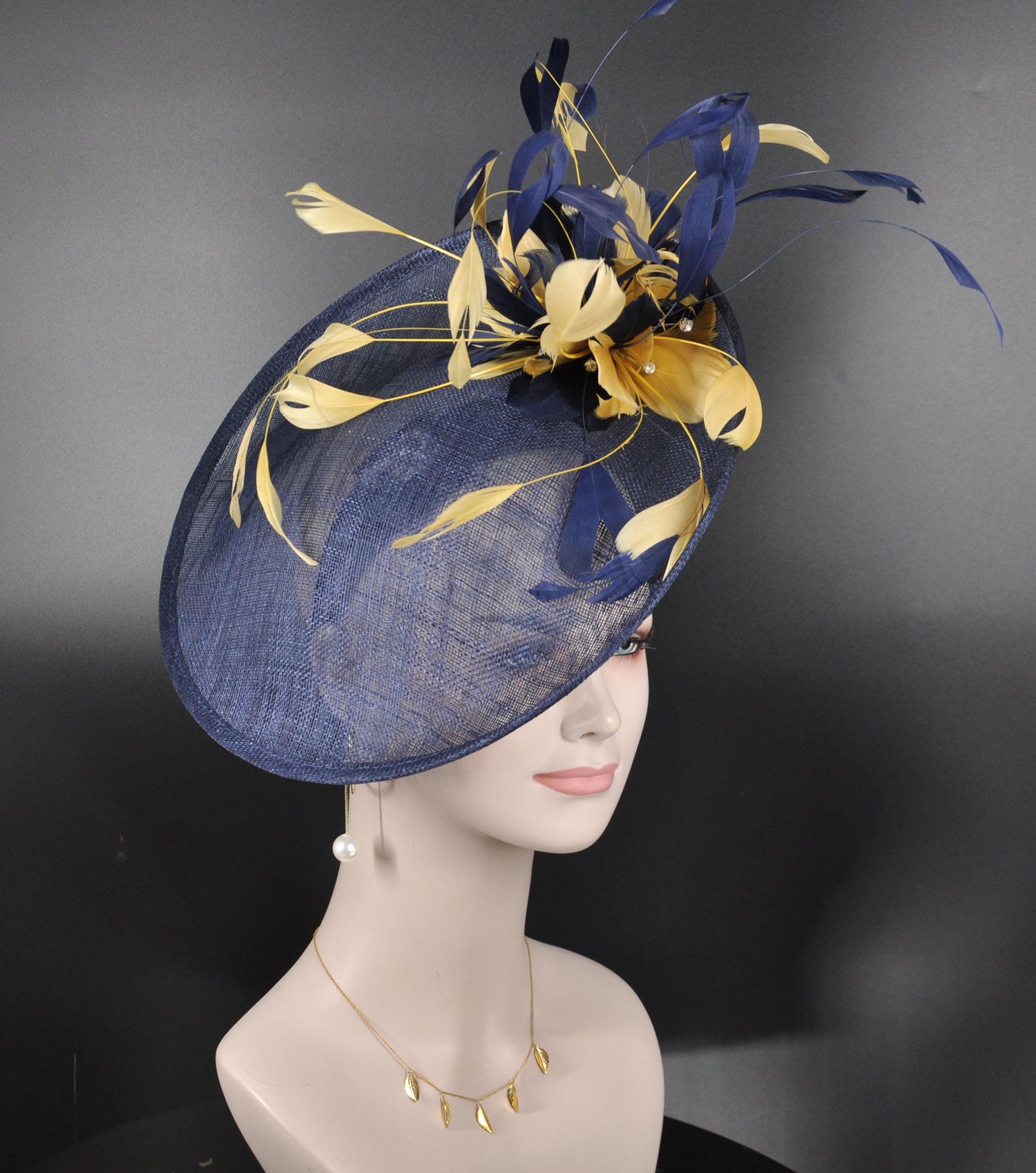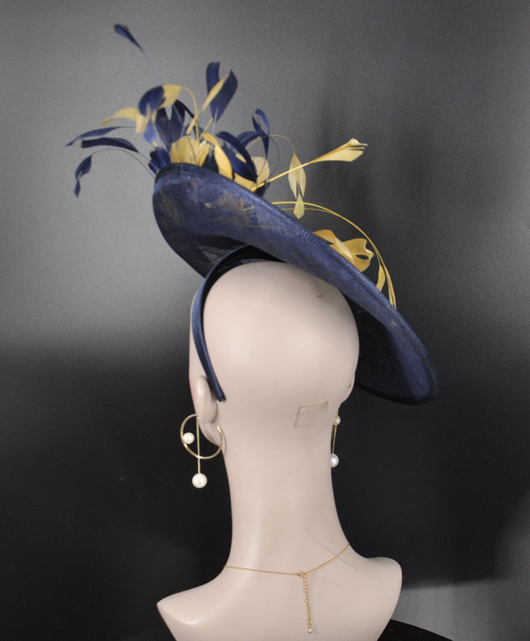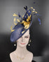 Navy Blue w Gold Feather Flowers Fascinator Hat Kentucky Derby Hat Tea Wedding Party Hat