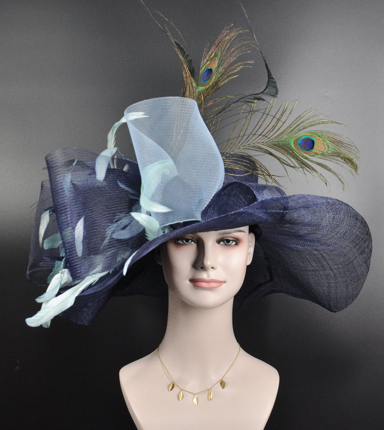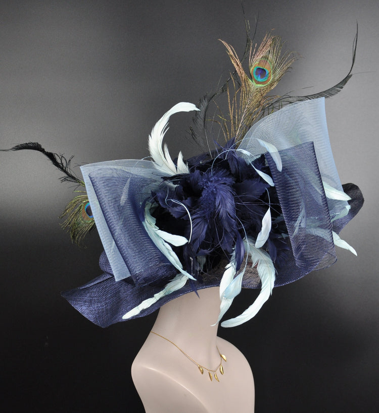 Navy Blue w Powder Blue Jumbo Bow and Feather Flowers Kentucky Derby Hat, Tea Party Hat Wide Brim Sinamay Hat