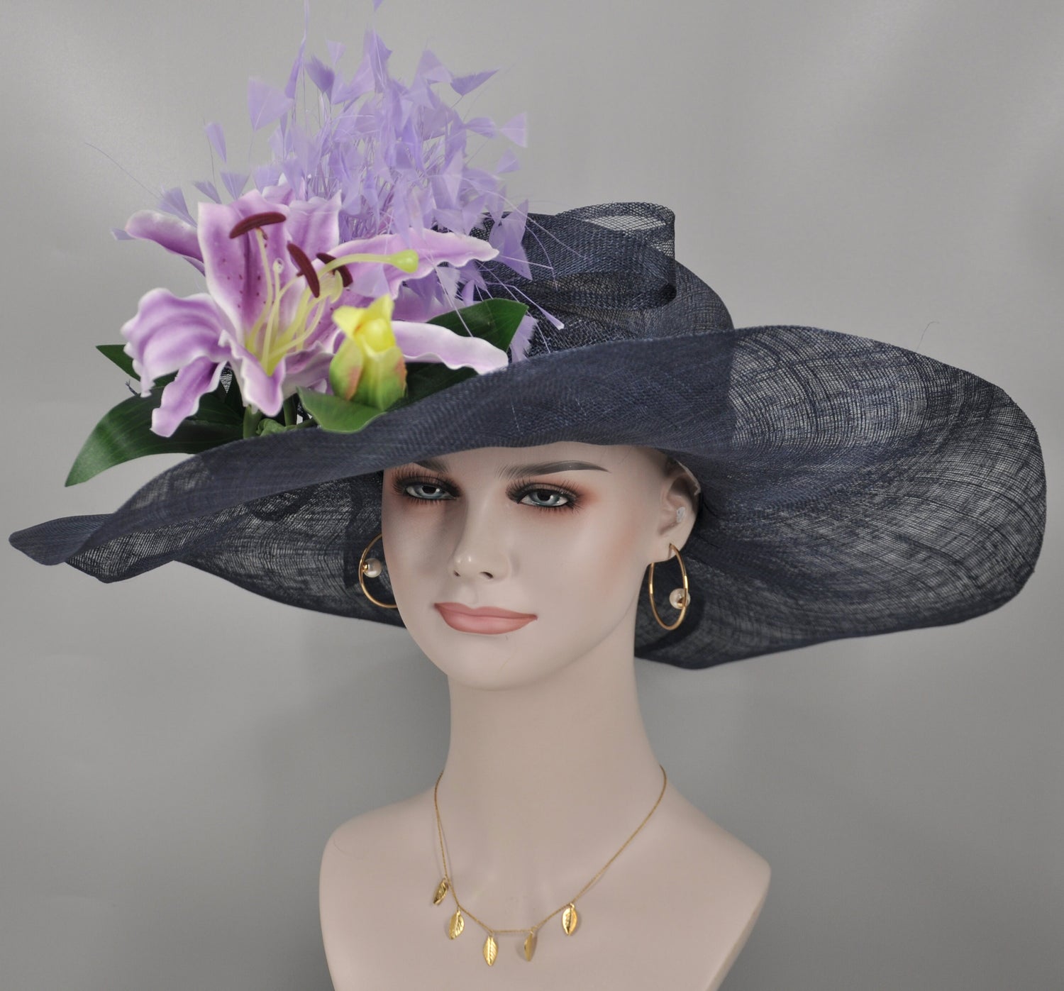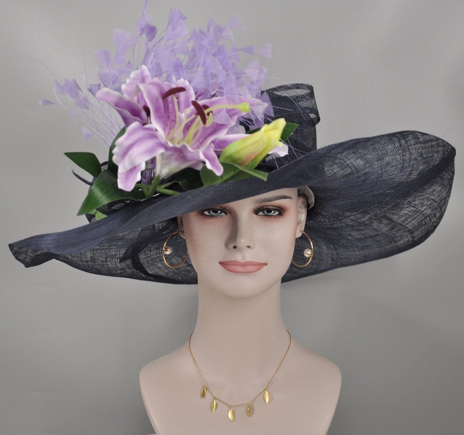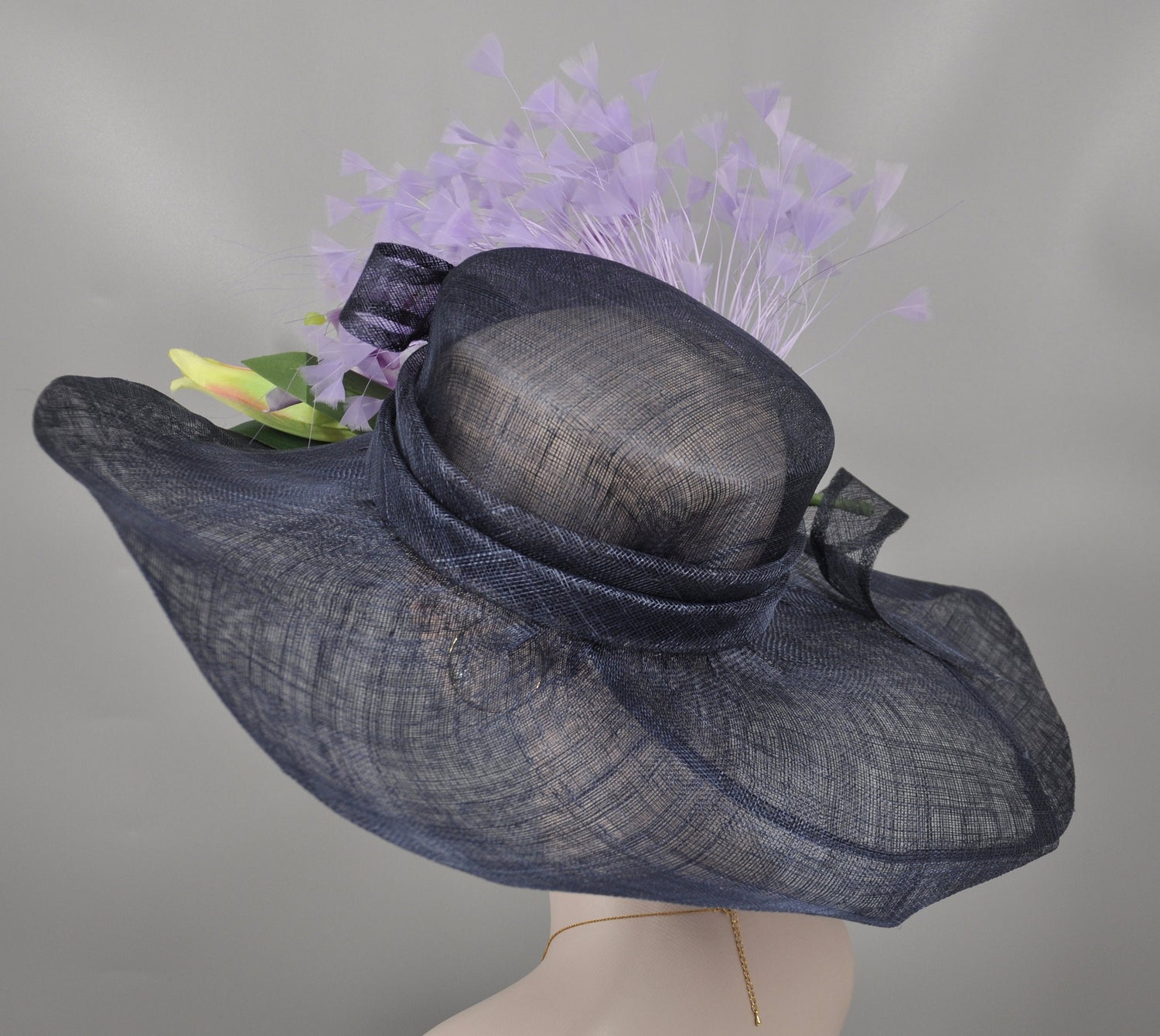 Navy Blue w Violet Purple Lily Flower + More Colors Options Feather Flower Wide Brim Sinamay Hat Kentucky Derby Hat, Church Wedding Easter