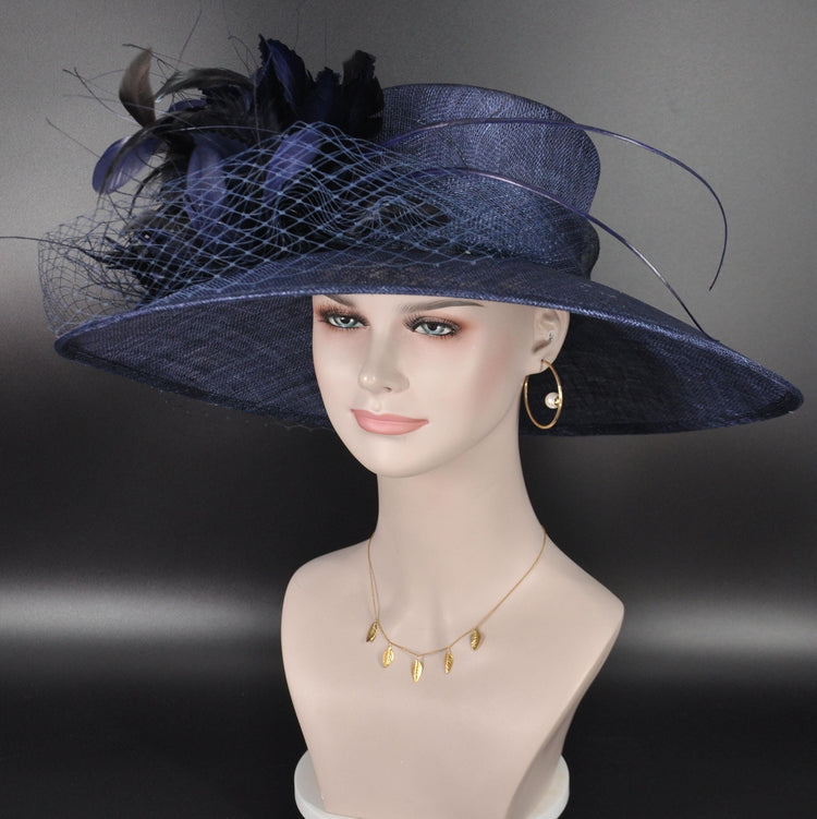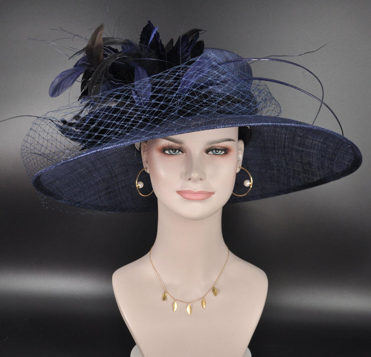 Navy Blue Wide Brim Sinamay Hat Church Kentucky Derby Hat Carriage Tea Party Wedding Feather Flower and Ostrich Quills