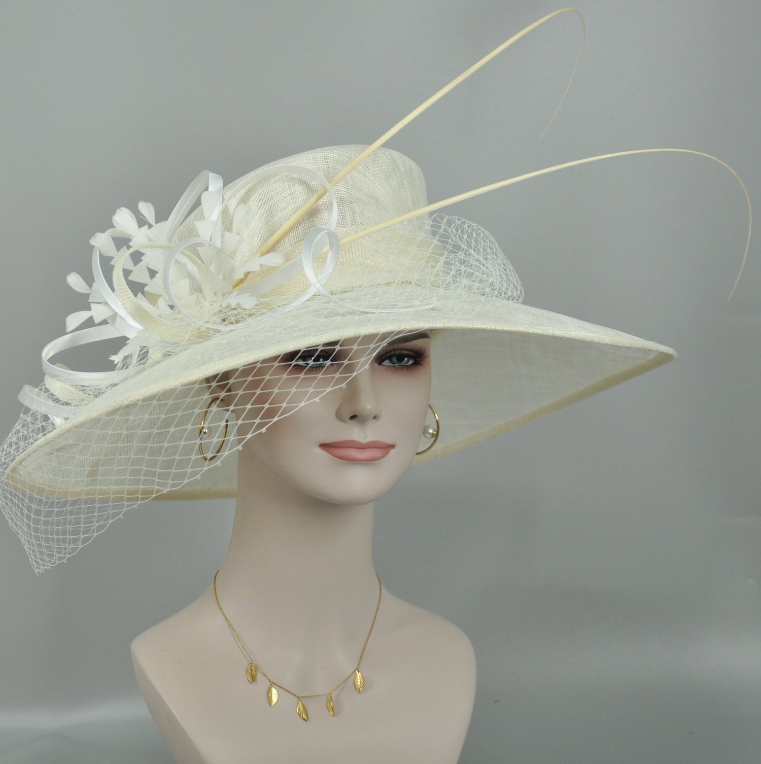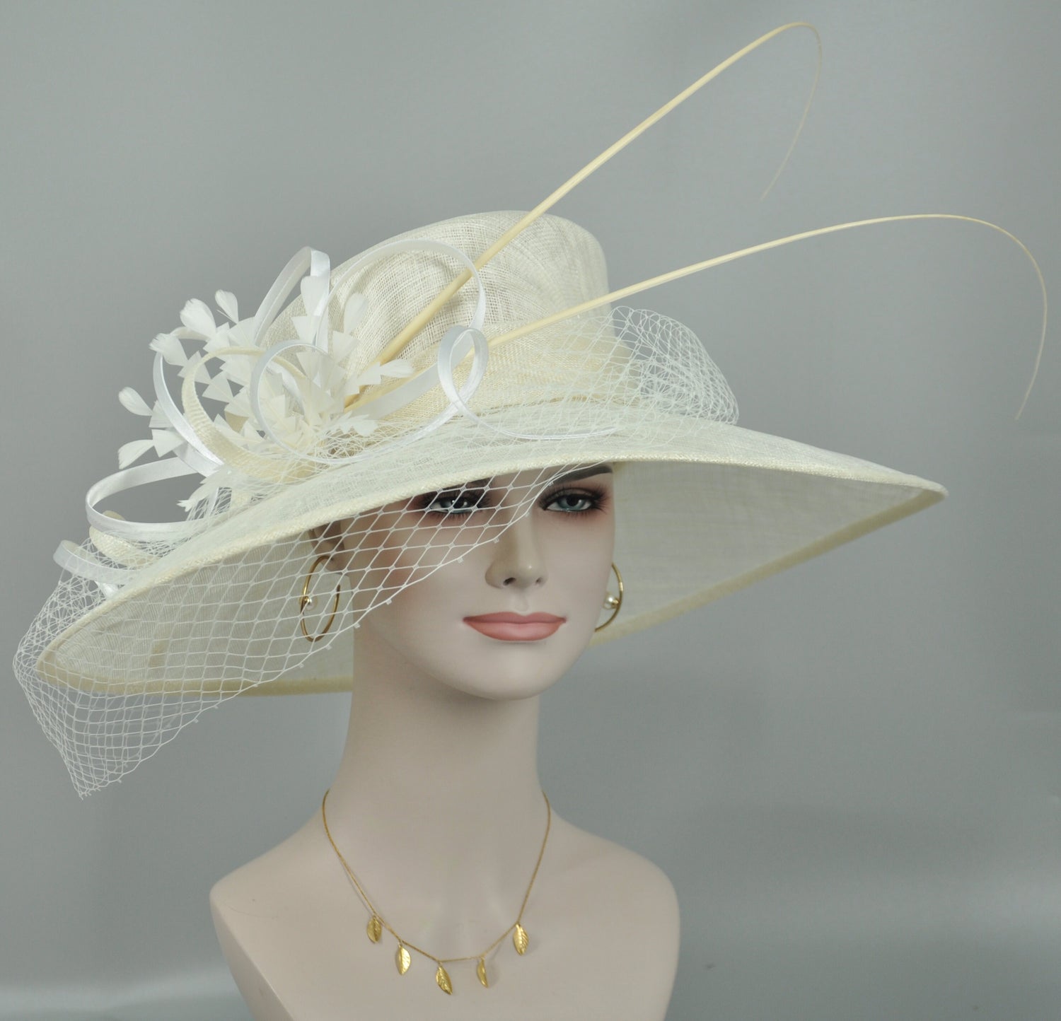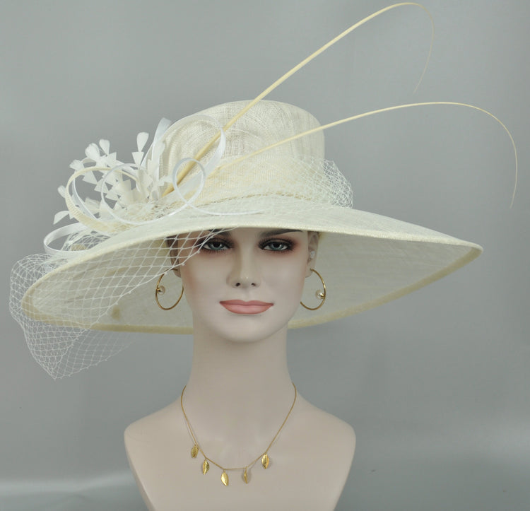 Off White Sinamay Kentucky Derby Hat: Wide Brim Wedding Ascot Hat