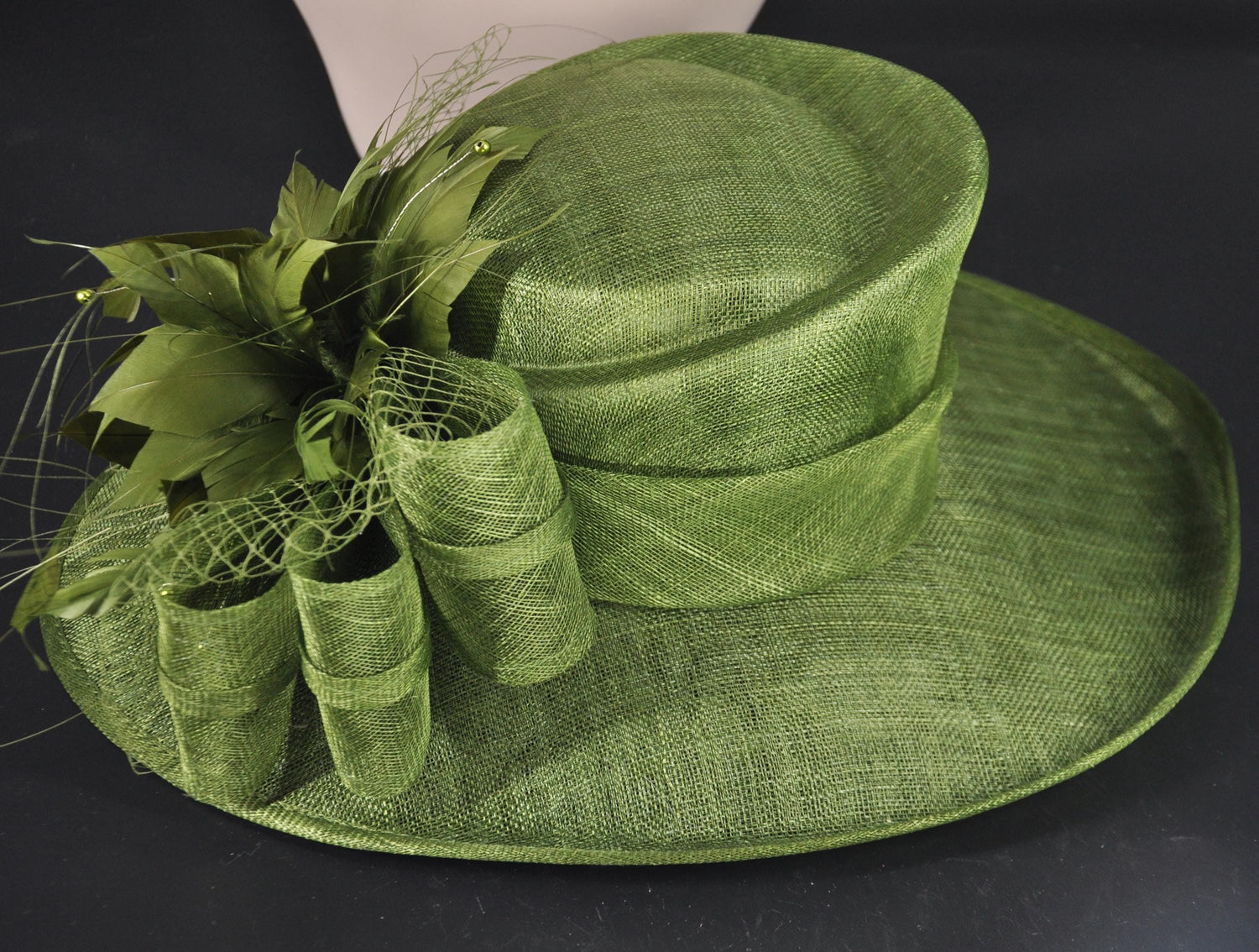 This stunning handcrafted Derby hat is designed to make a statement at any special event. Featuring elegant Olive Green sinamay, vibrant Olive Green accents, decorative bows, and luxurious feathers, this wide-brim hat adds a sophisticated finishing touch to your race-day or formal outfit. Perfect for the Kentucky Derby, Royal Ascot, garden parties, weddings, or any occasion where you want to stand out with timeless elegance.