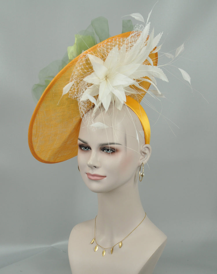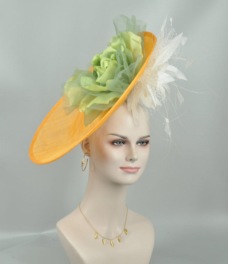 Have questions? Feel free to reach out—we’re happy to help!.Large Brim Sinamay Fascinator Hat with Silk and Feather Flowers