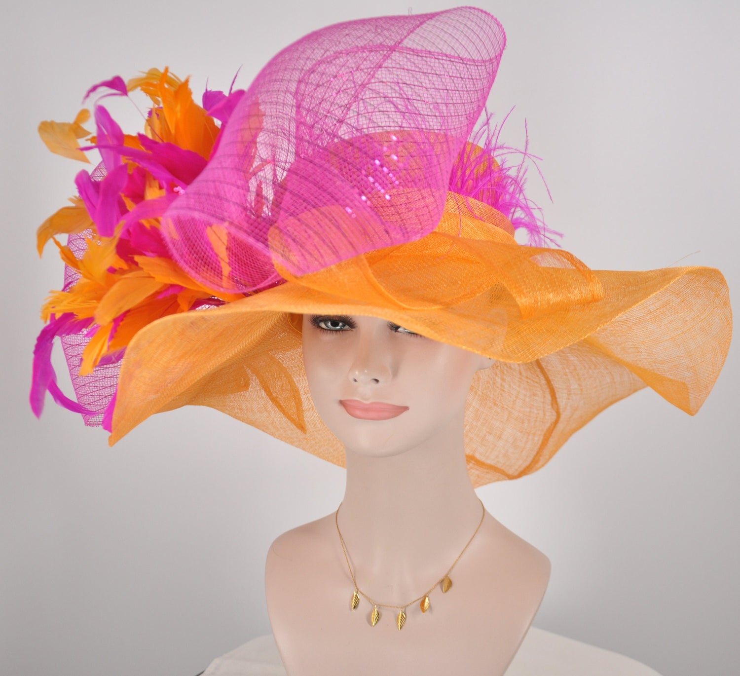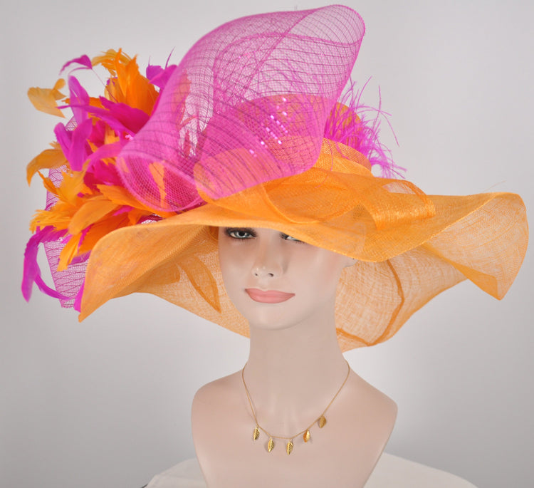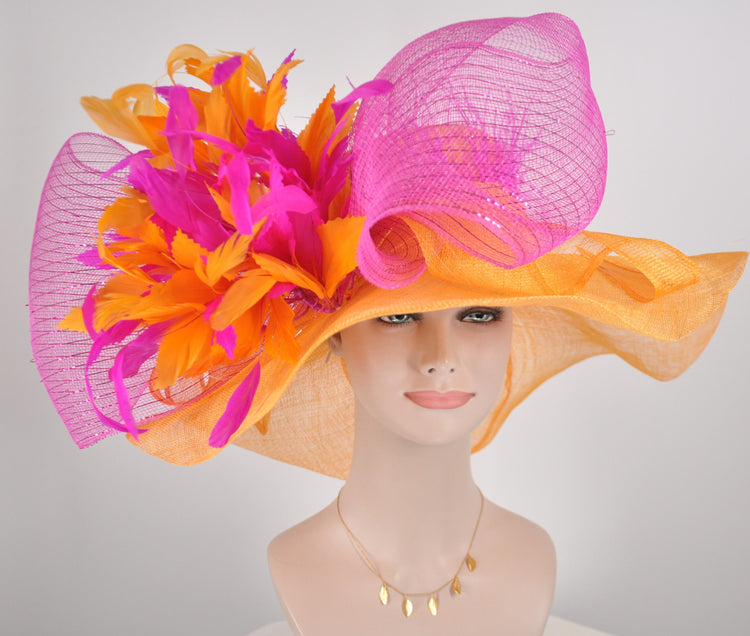Orange Sinamay Kentucky Derby Hat: Hot Pink Bow & Feather Flowers