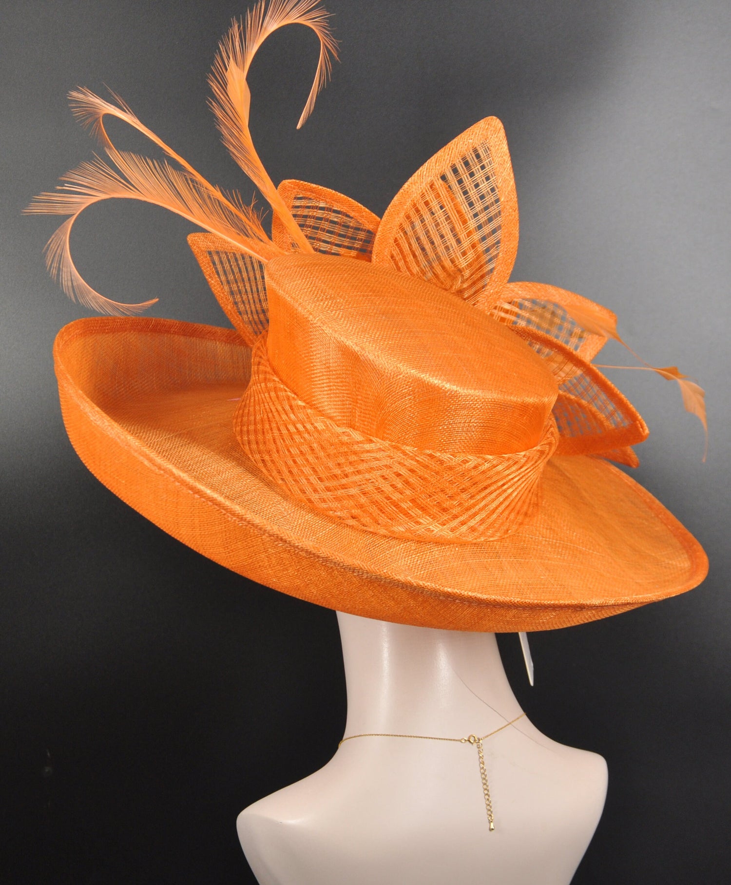 Orange Sinamay Kentucky Derby Hat: Wide Brim Feathered Ascot Hat