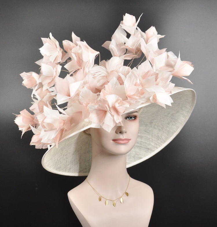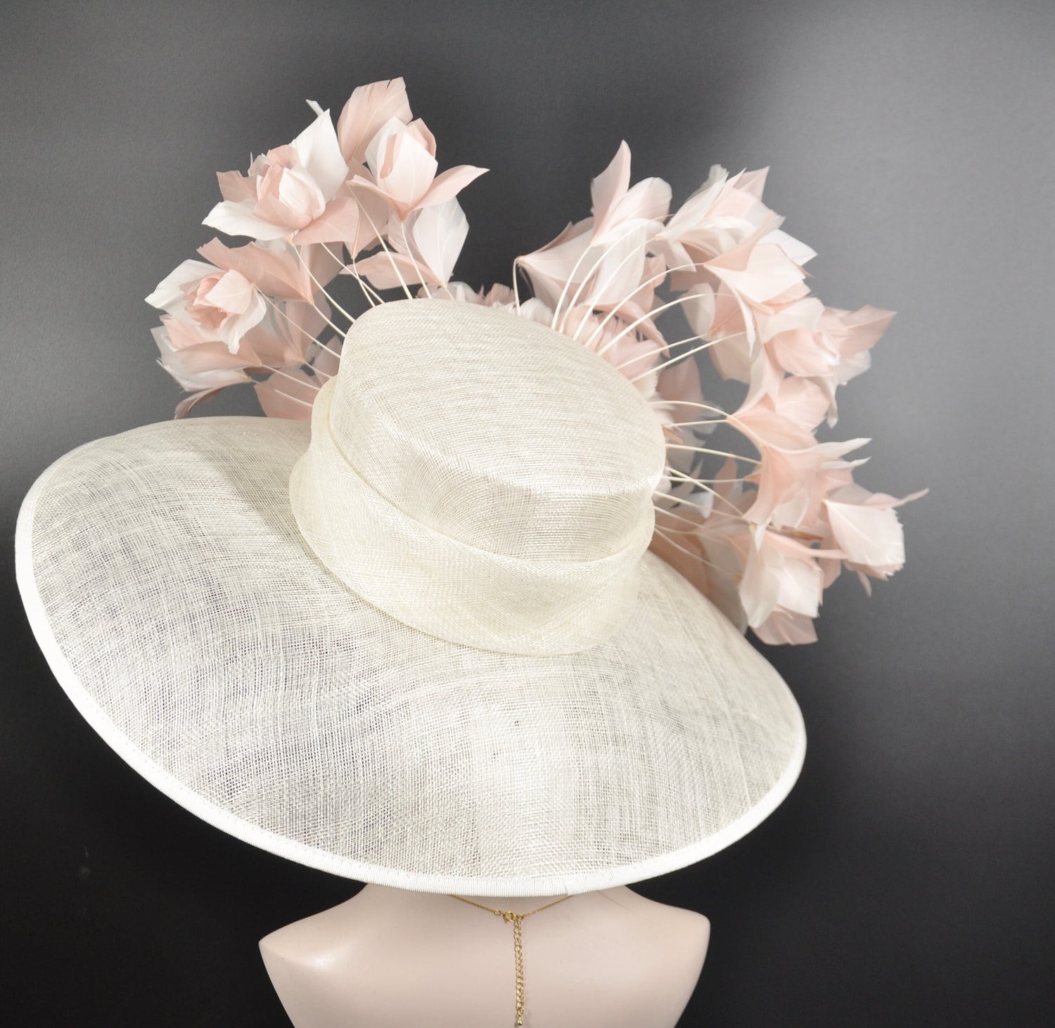 Pink Day, Church, Kentucky Derby Hat,Wide Brim Sinamay Hat ,Carriage, Tea Party ,Wedding , Off White/Ivory W Blush/Dusty Pink Feather Flower