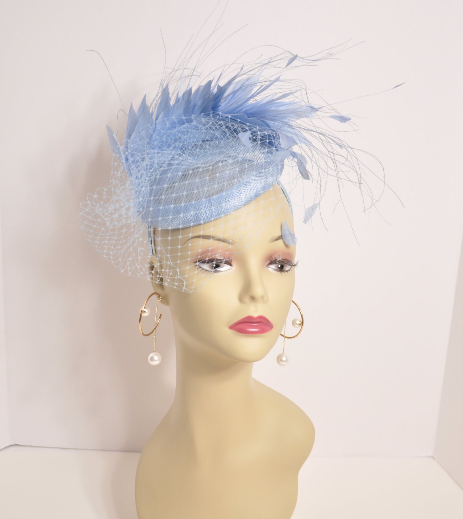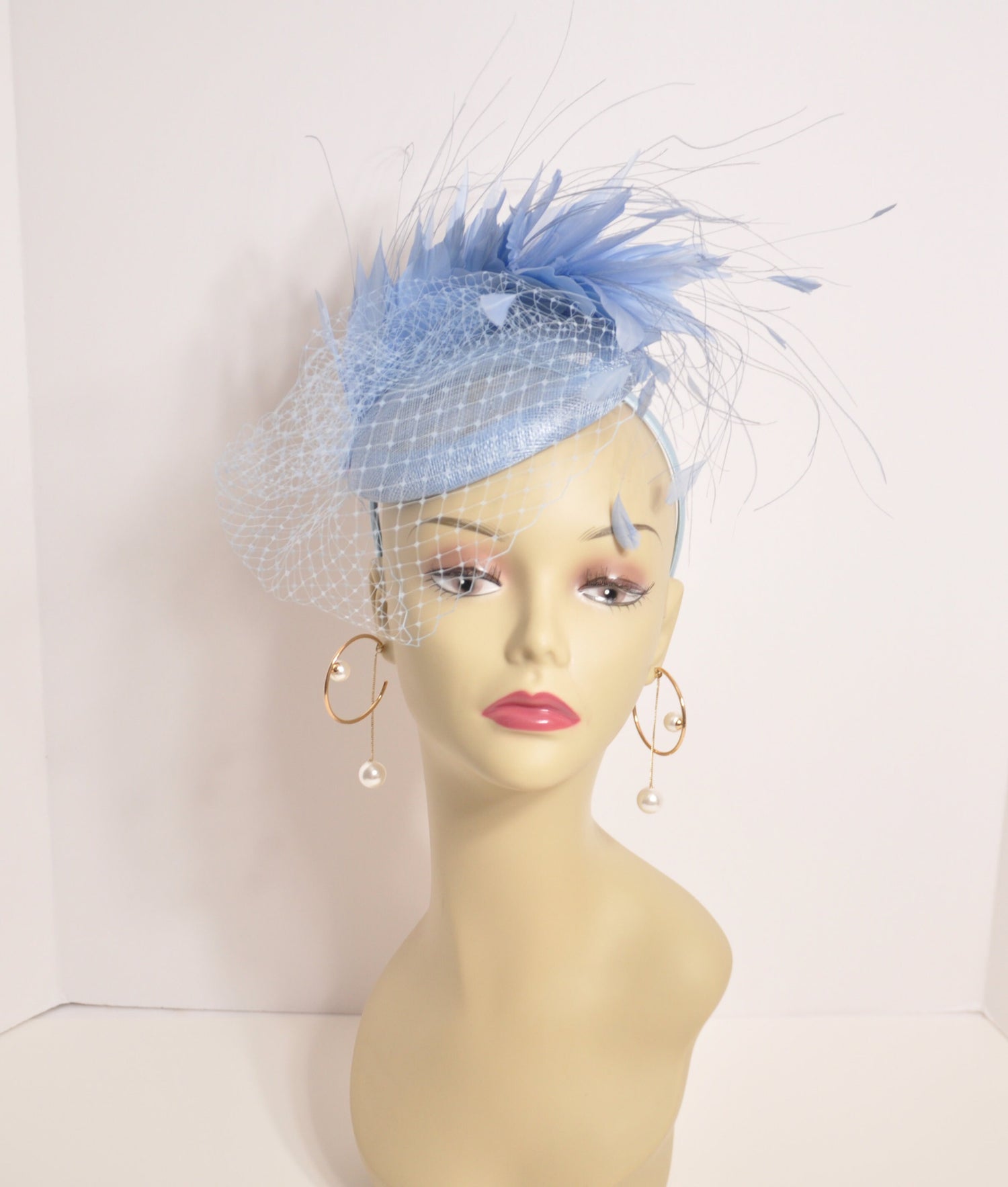 Powder Blue Feather Fascinator Hat: Sinamay Headband, Royal Ascot Races