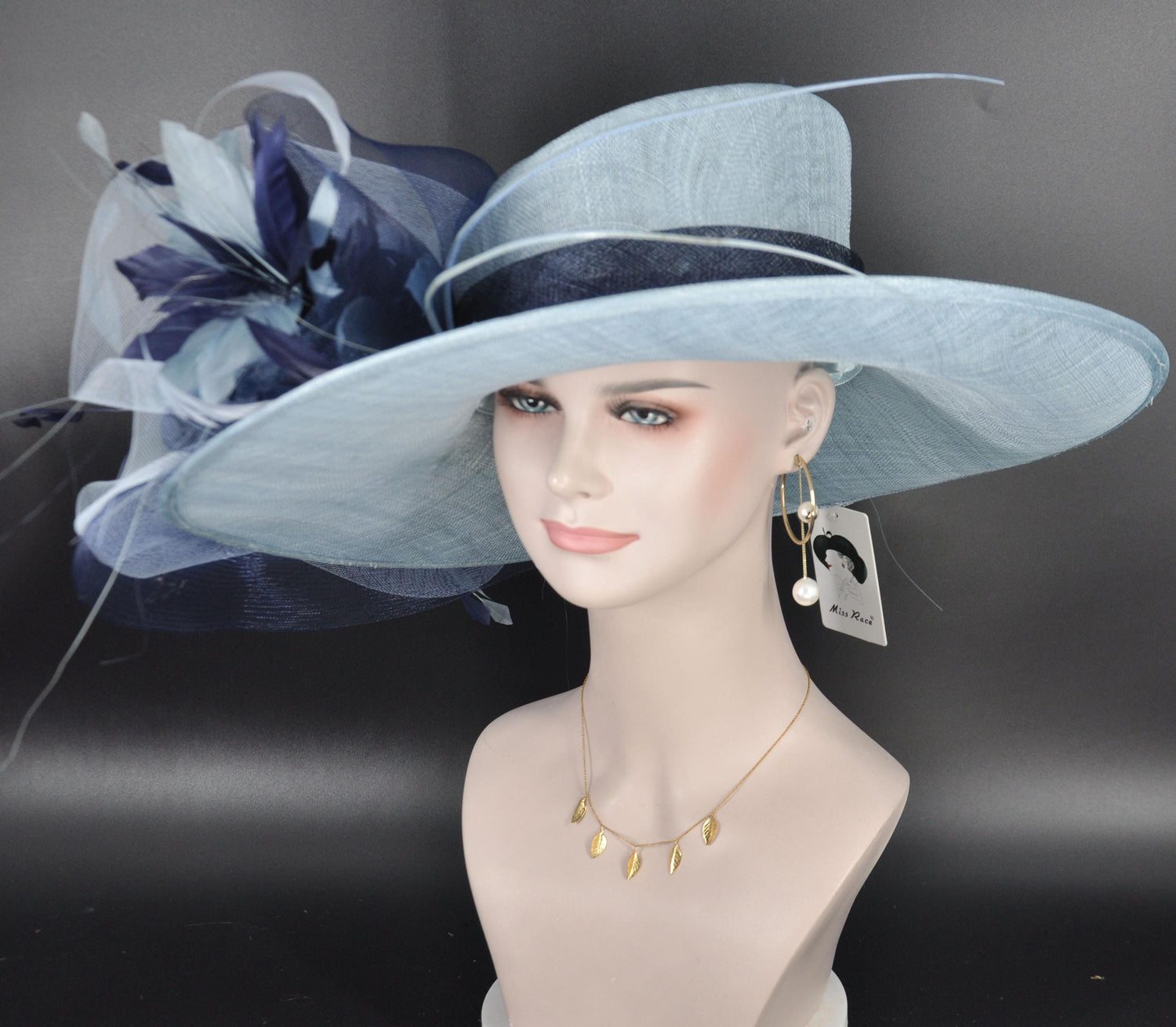 Powder Blue Sinamay Derby Hat: Navy Feather Ascot Headpiece