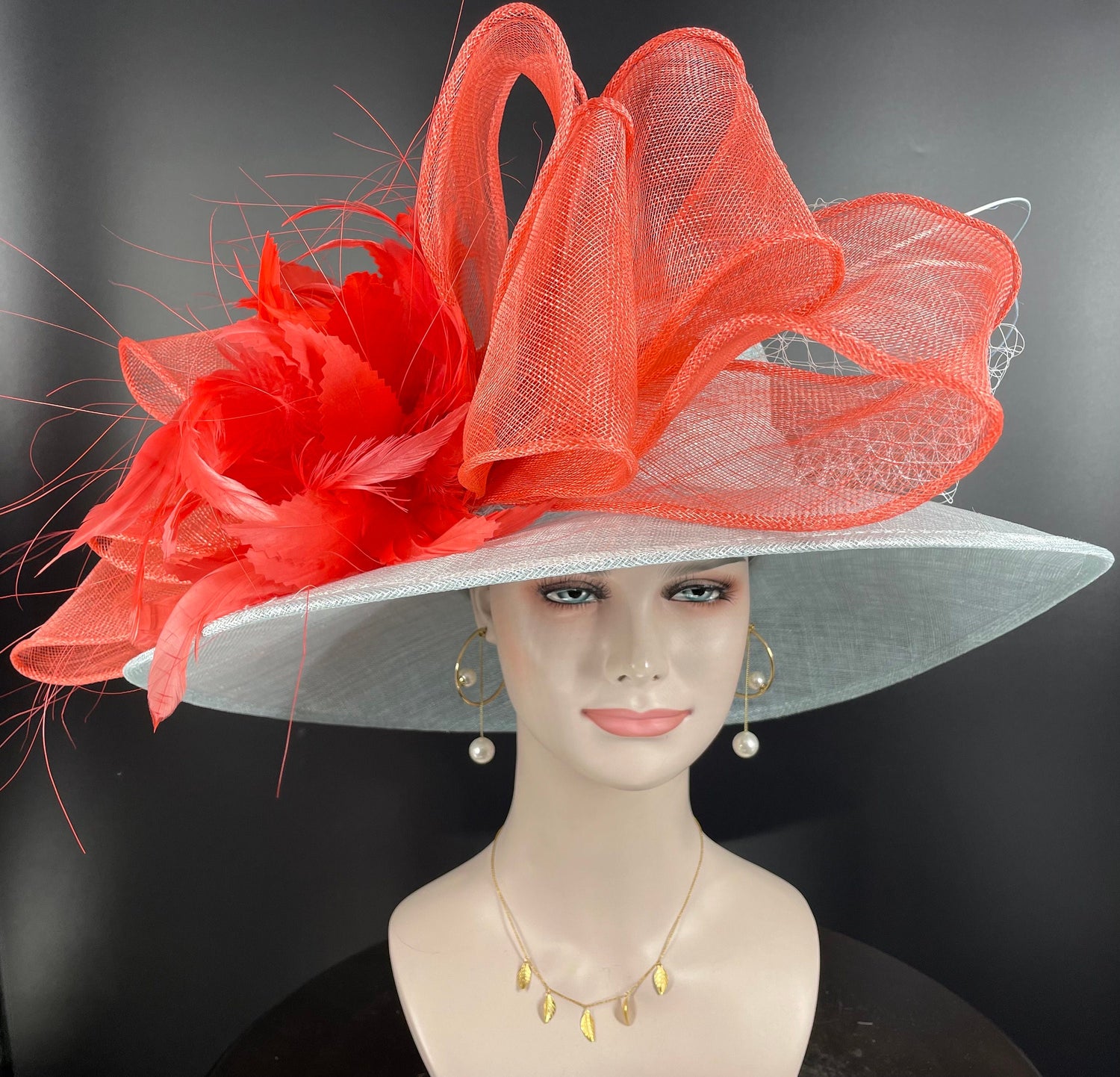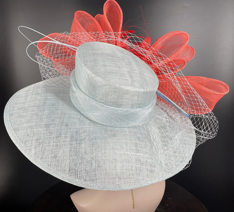 Powder Blue Sinamay Kentucky Derby Hat: Coral Feather Flower Bows