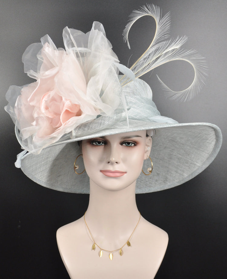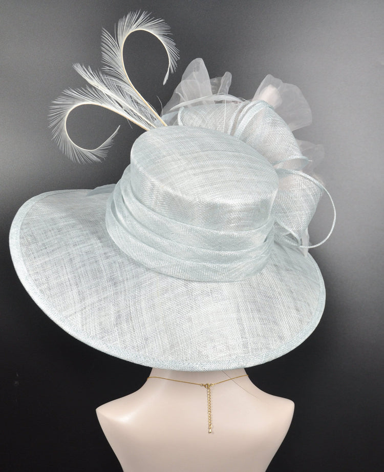 Powder Blue Sinamay Kentucky Derby Hat: Wide Brim Feathered Tea Party Hat