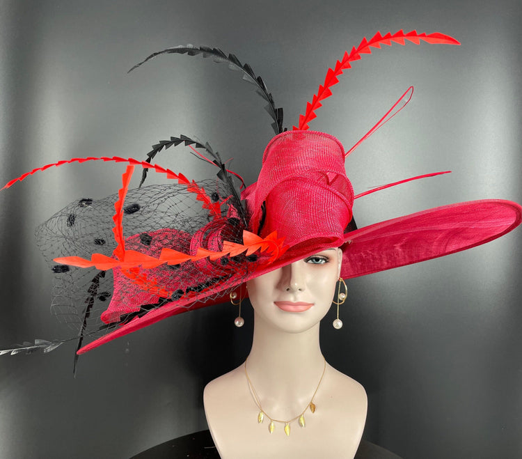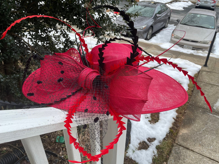 Red & Black Sinamay Derby Hat: Wide Brim Feather Ascot Hat