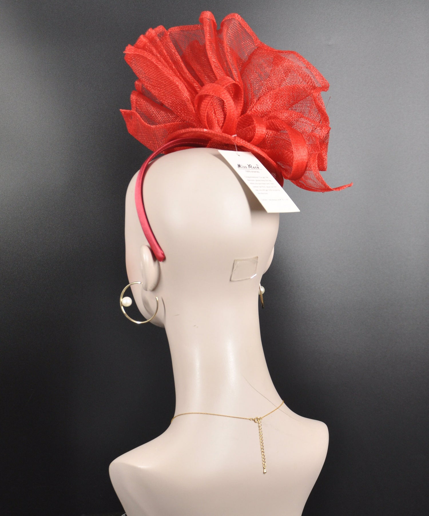 Have questions? Feel free to reach out—we’re happy to help!.This is a pretty Fascinator in red sinamay base hat, set on a headband.