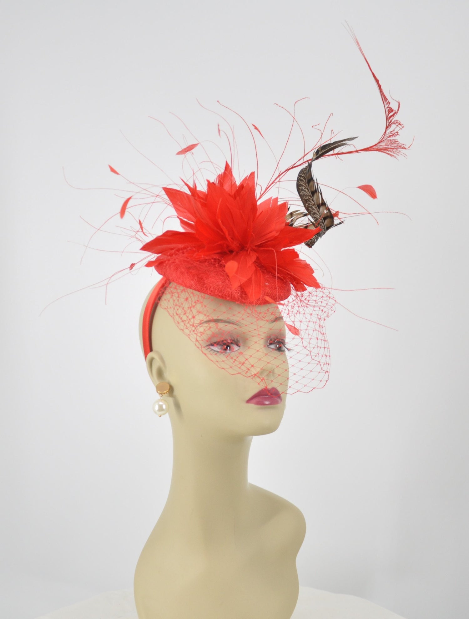 Red Sinamay Disc Fascinator Hat with Red Jumbo Feather Flower,Colorful Feathers ,Jumbo Netting