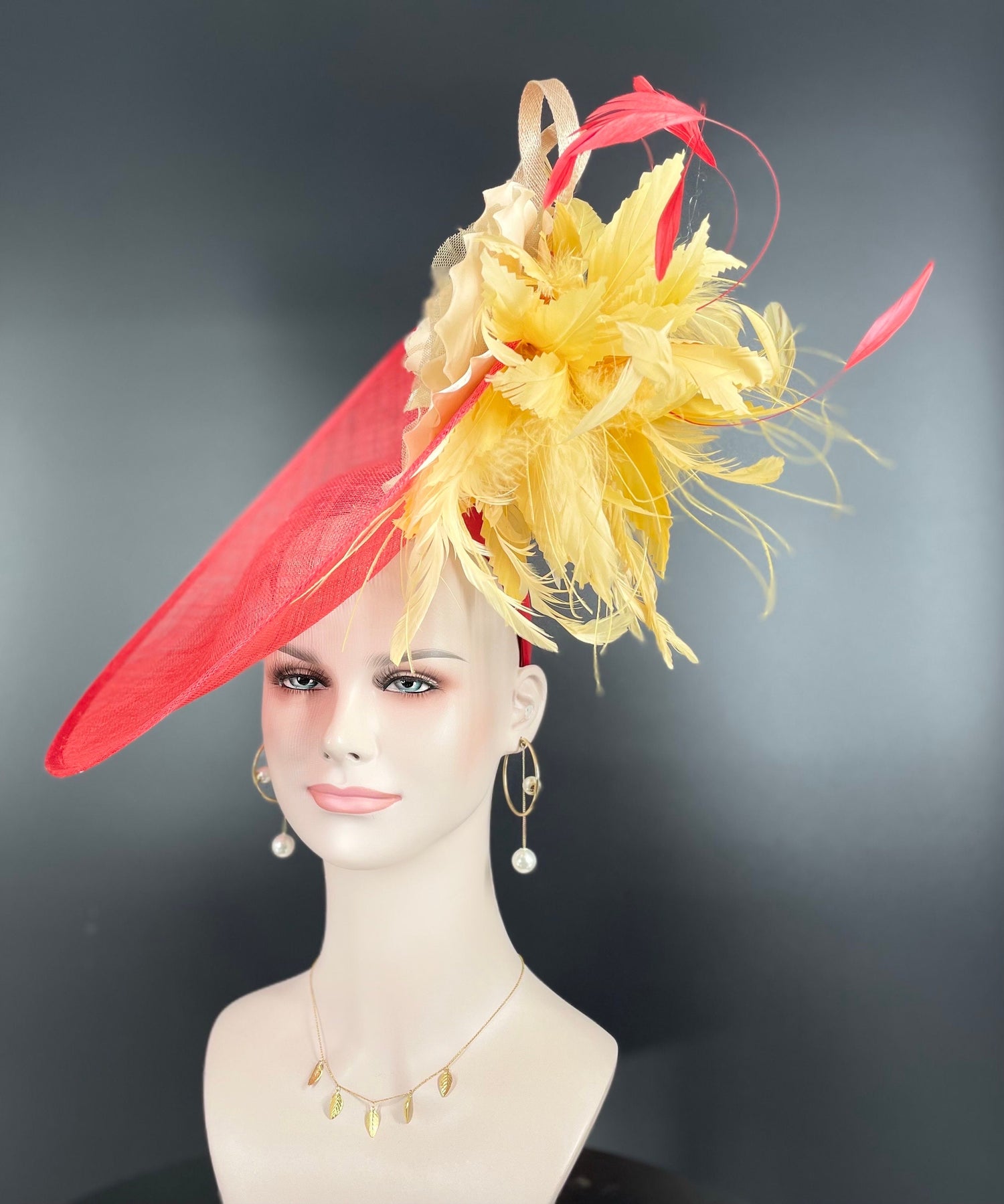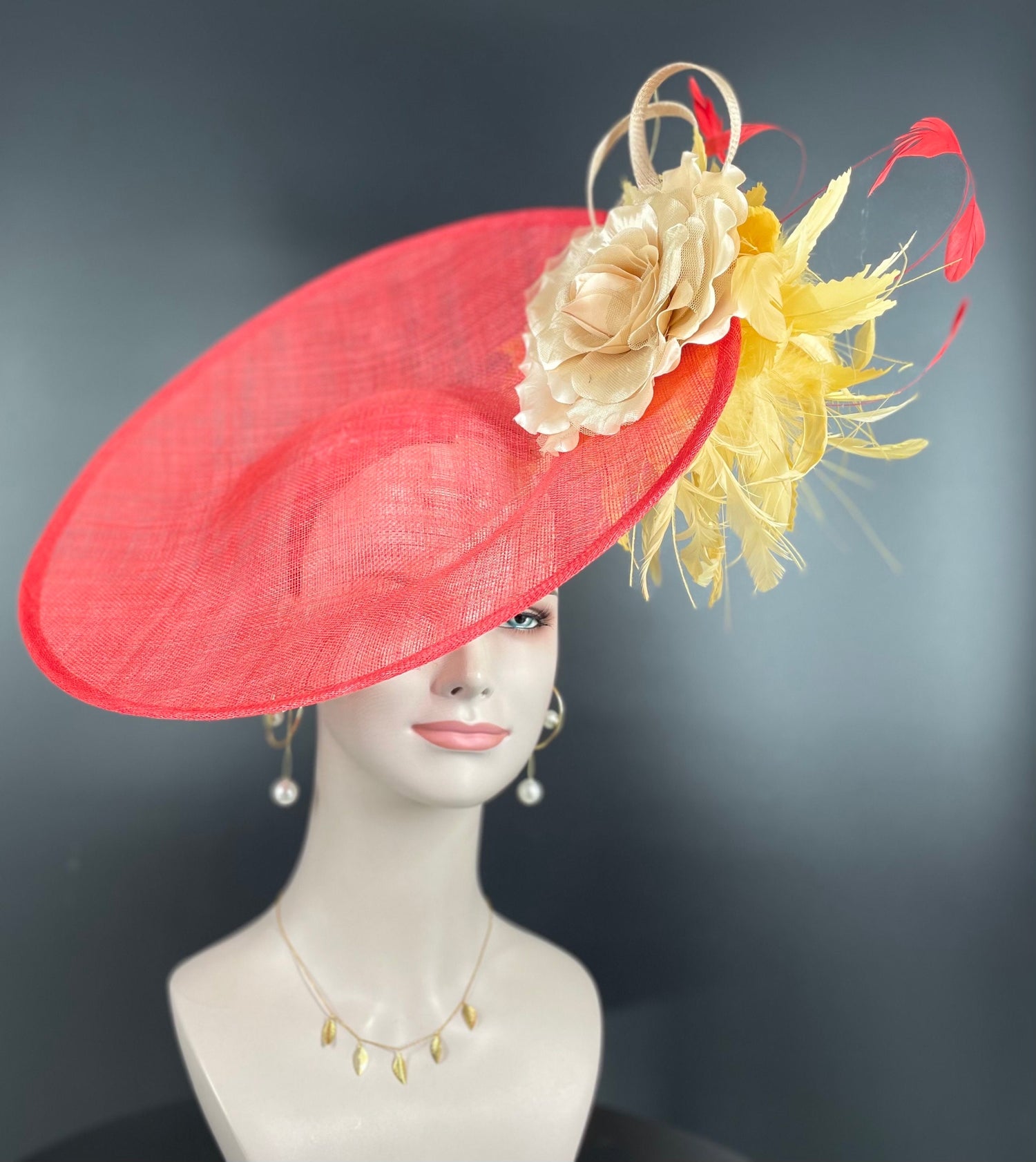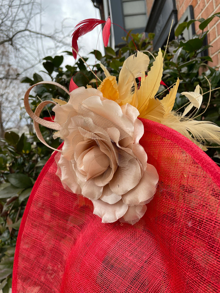 Red Sinamay Fascinator Hat: Champagne Silk Flower, Kentucky Derby