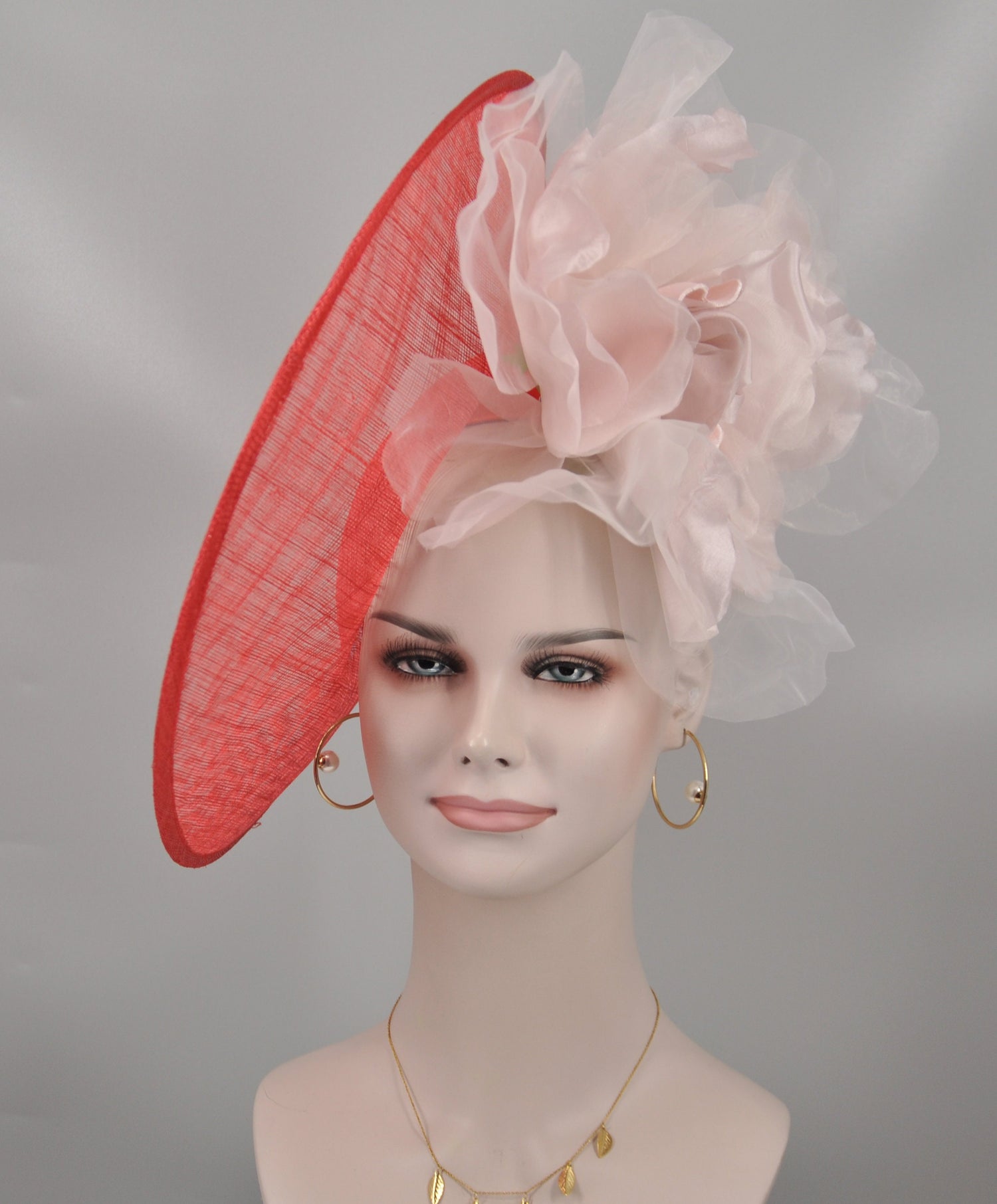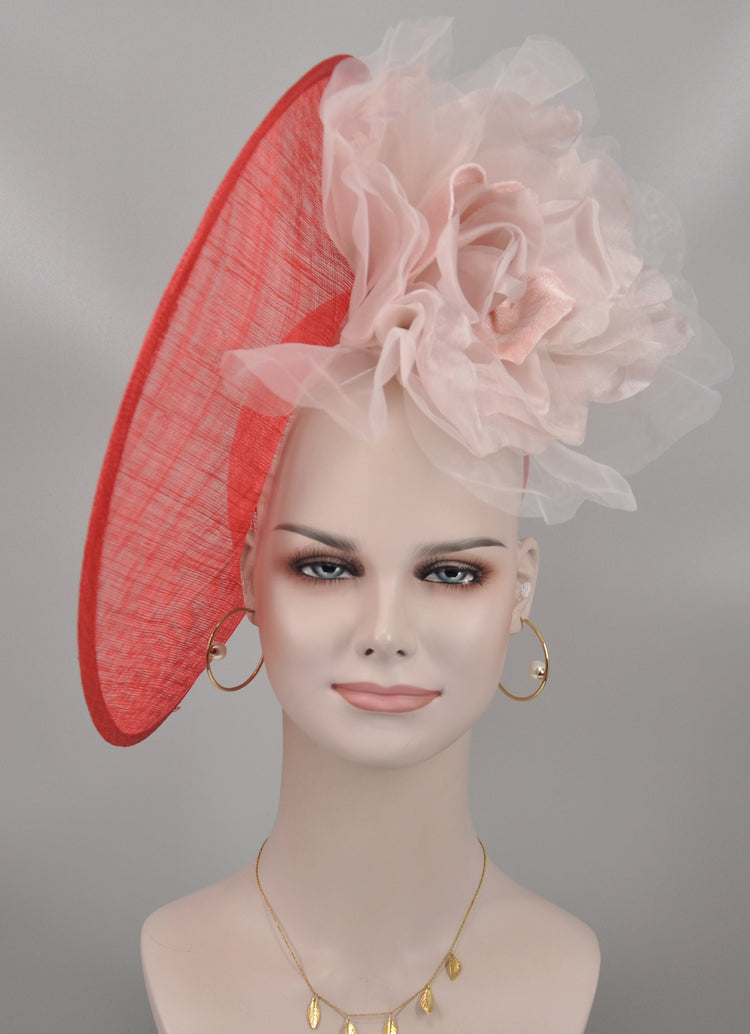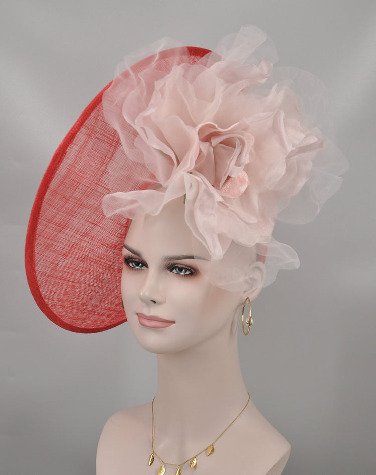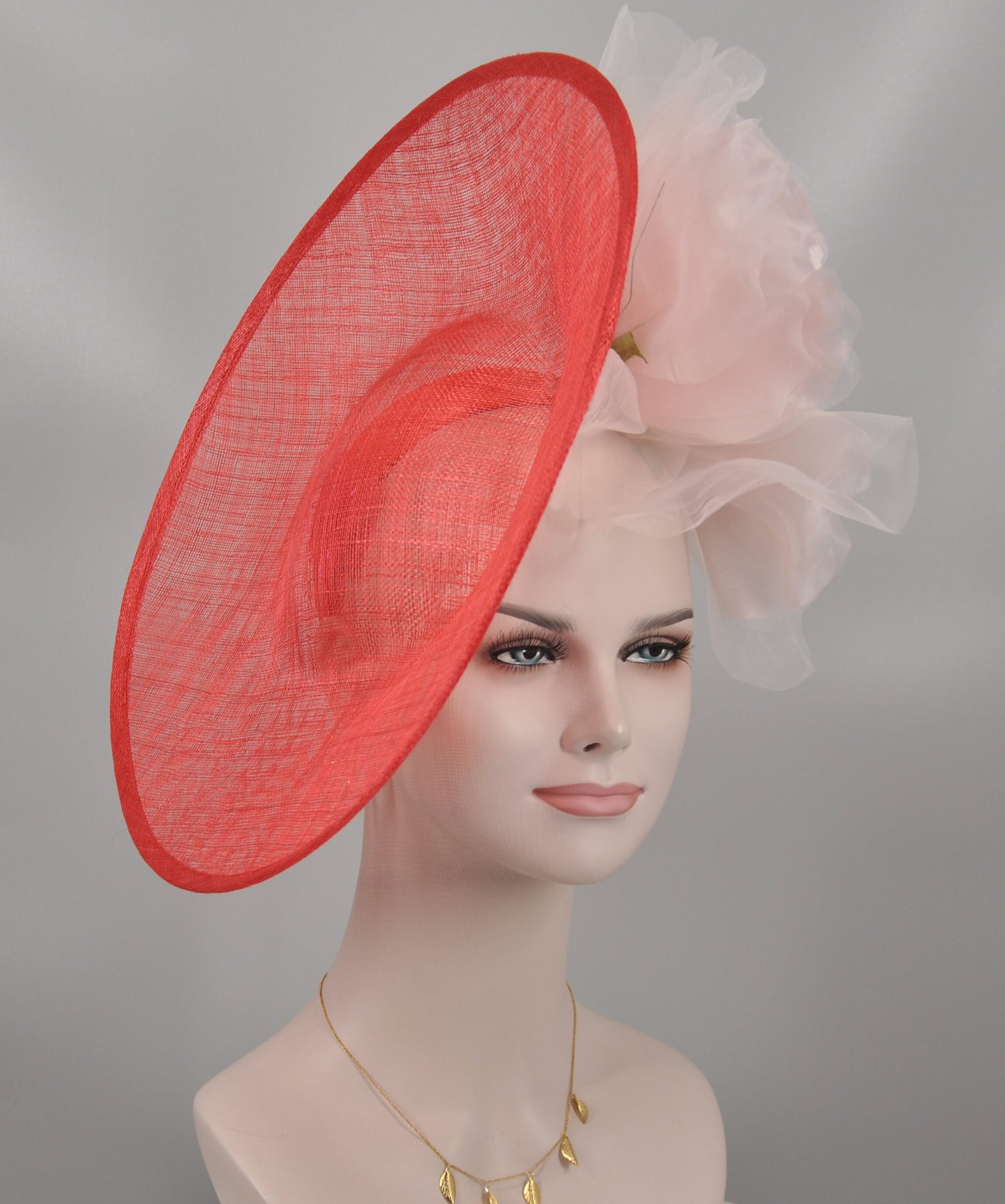 Red Sinamay Kentucky Derby Hat: Blush Pink Silk Flower, Upturned Brim (16.14" Diameter)