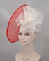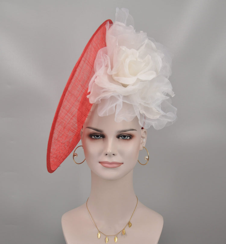 Red Sinamay Kentucky Derby Hat: White Silk Flower Fascinator (16.14" Diameter)