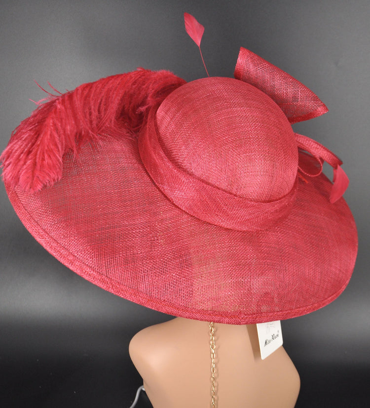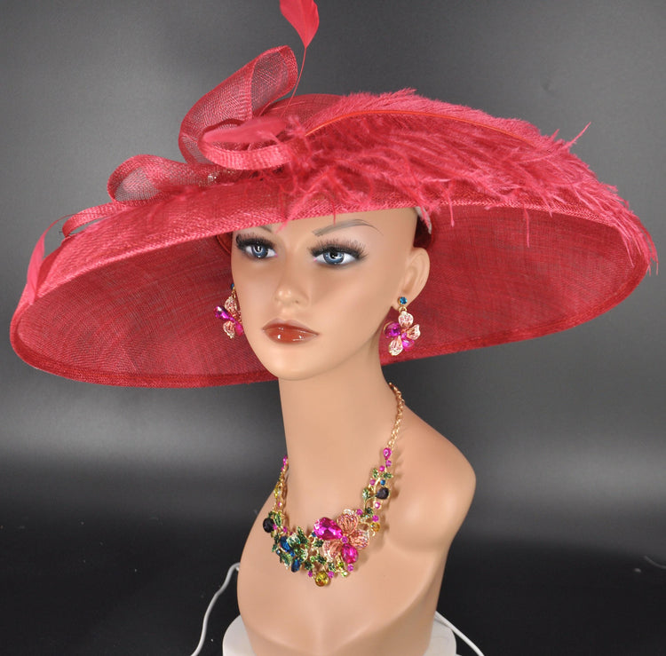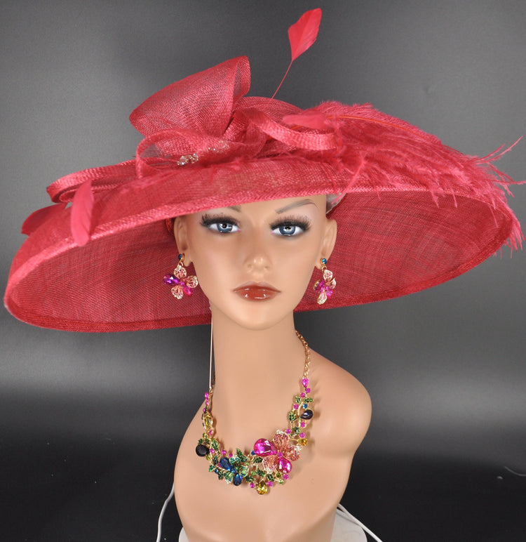Red Wide Brim Sinamay Hat Church Kentucky Derby Hat Carriage Tea Party Wedding Rhinstones w Sinamay Bow Ostrich Feather