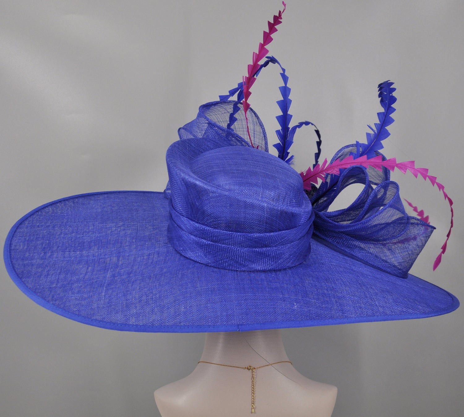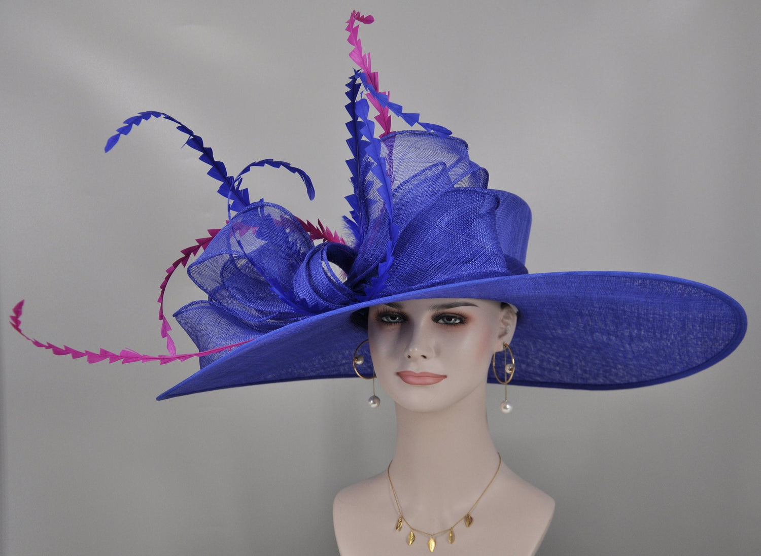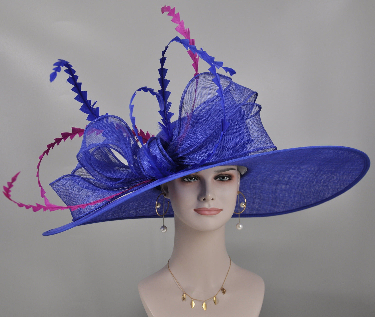 Royal Blue Derby Hat: Feathered Sinamay Bow Ascot Hat