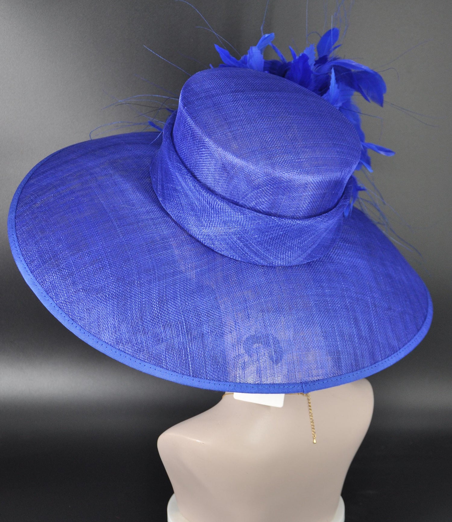 Royal Blue Kentucky Derby Hat: Feather Flowers, Wide Brim Sinamay