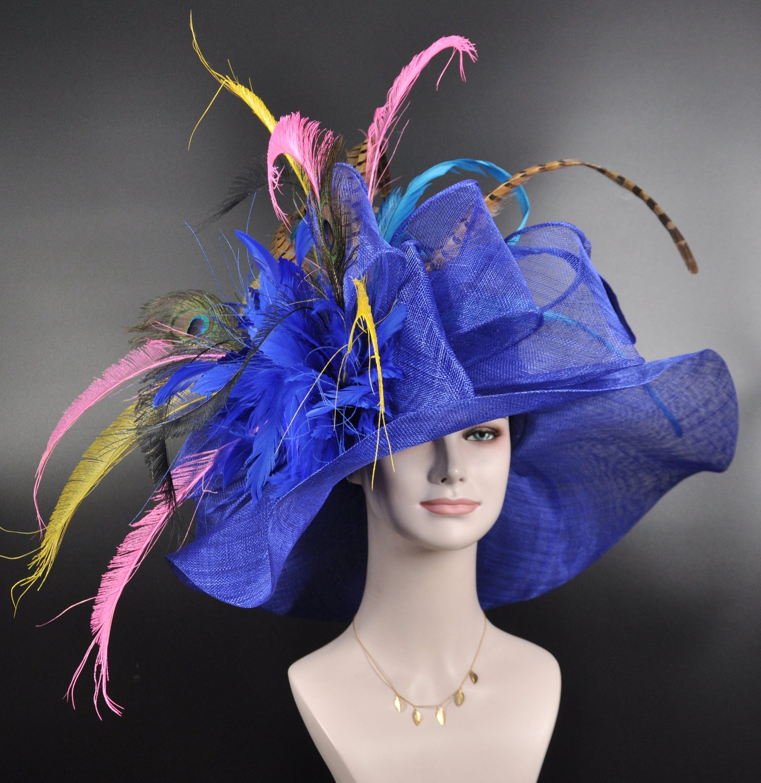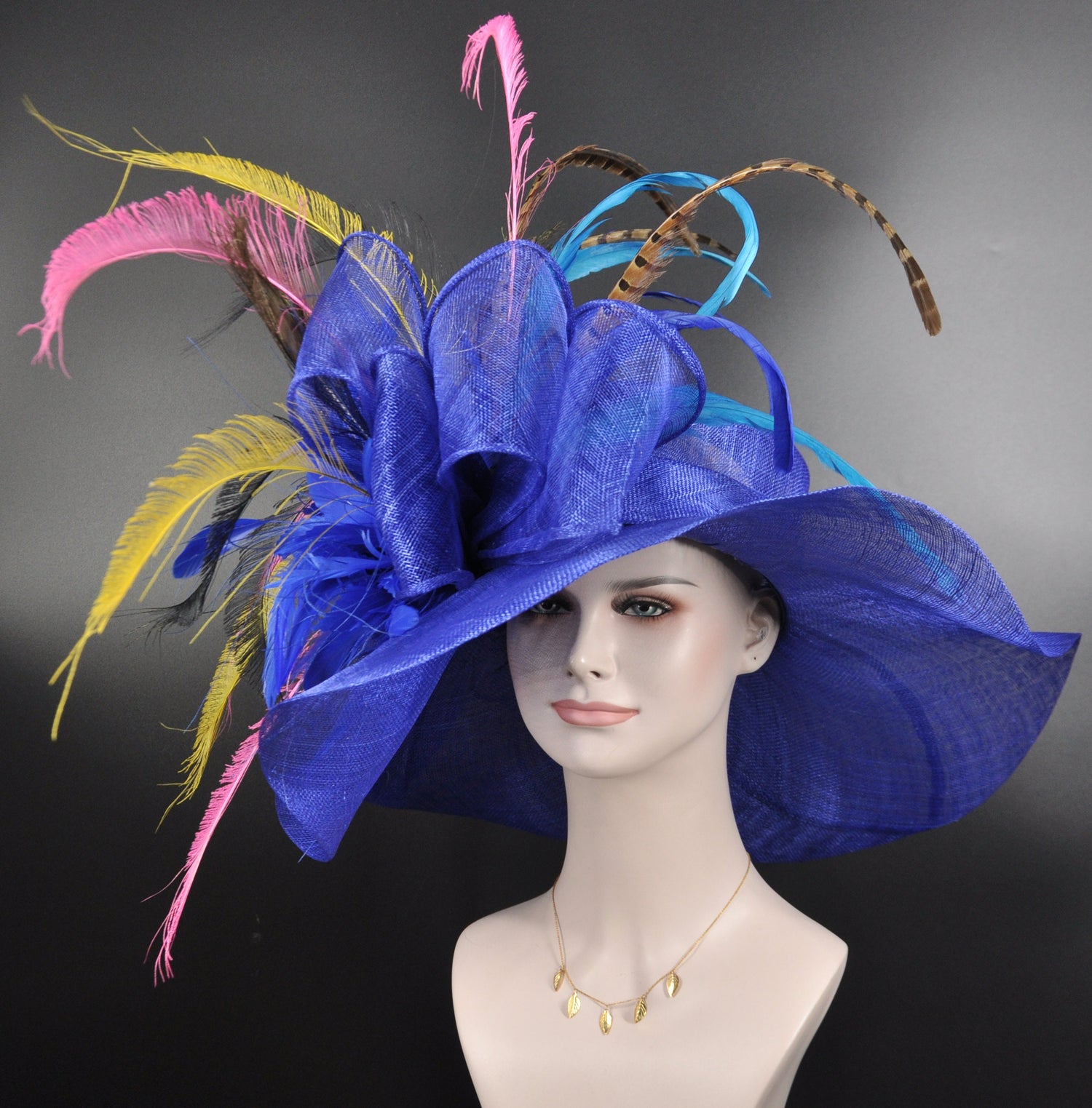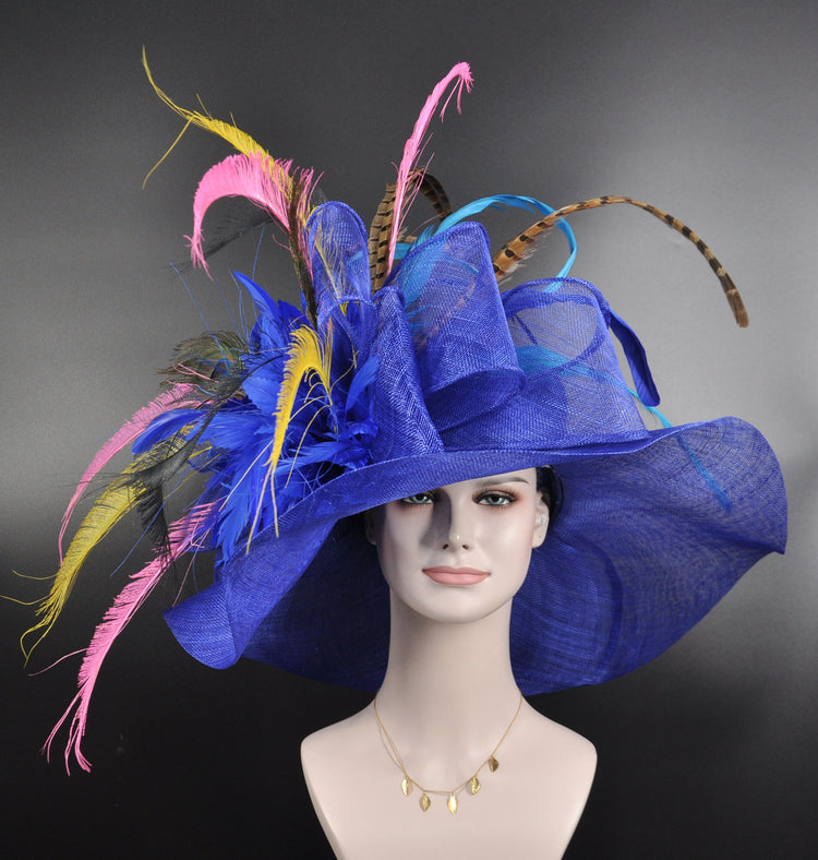 Royal Blue Kentucky Derby Hat: Wide Brim Sinamay Feather Fascinator