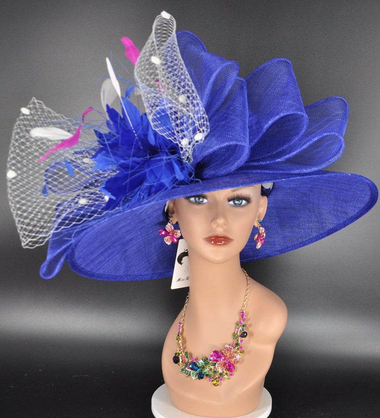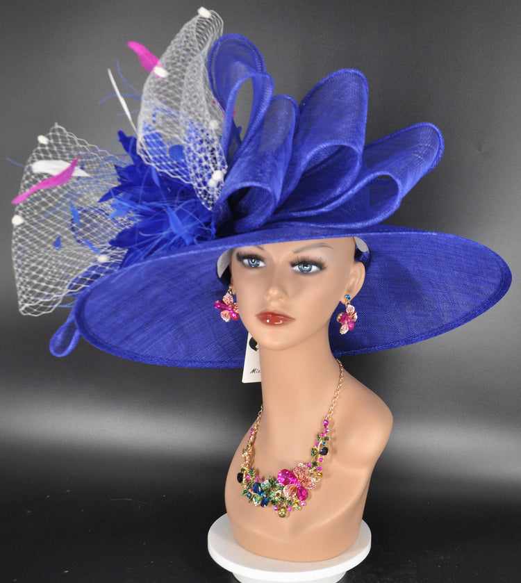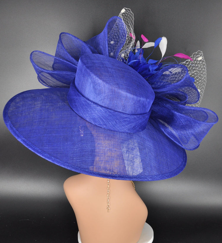 Royal Blue Sinamay Kentucky Derby Hat: Jumbo Bow & Ivory Netting