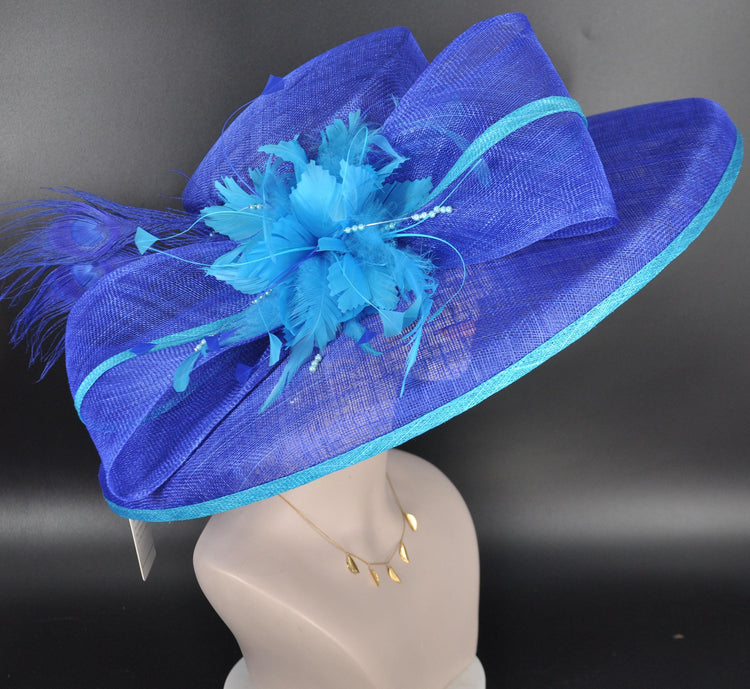 Royal Blue w Teal Blue Feather Hat, Kentucky Derby, Tea Party, Wedding, Church, Royal Ascot Wide Brim Sinamay Hat Oaks Day Hat