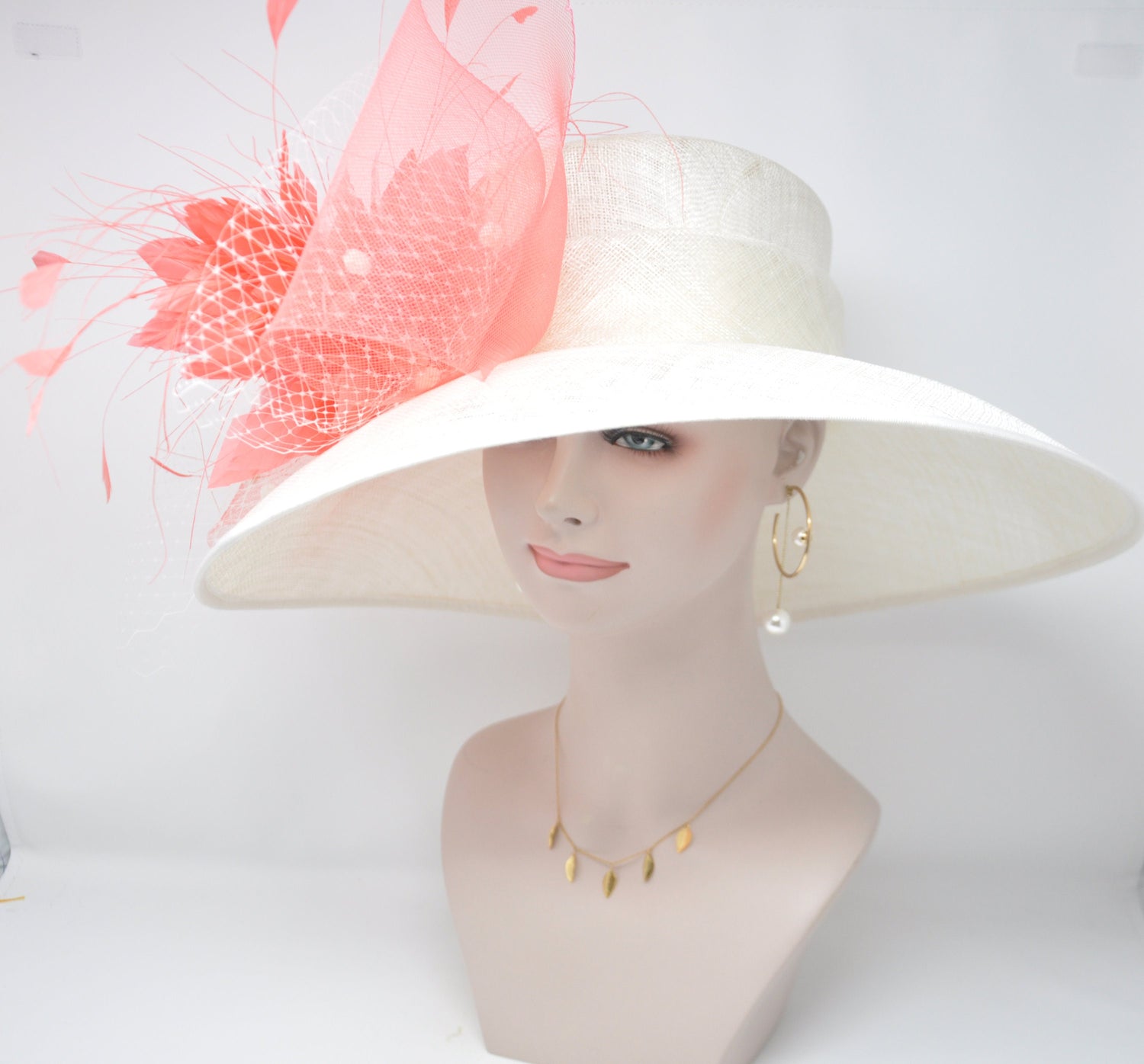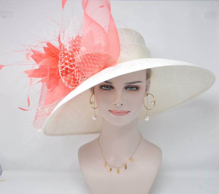 Sinamay Derby Hat: Ivory Wide Brim with Coral Feather Flowers
