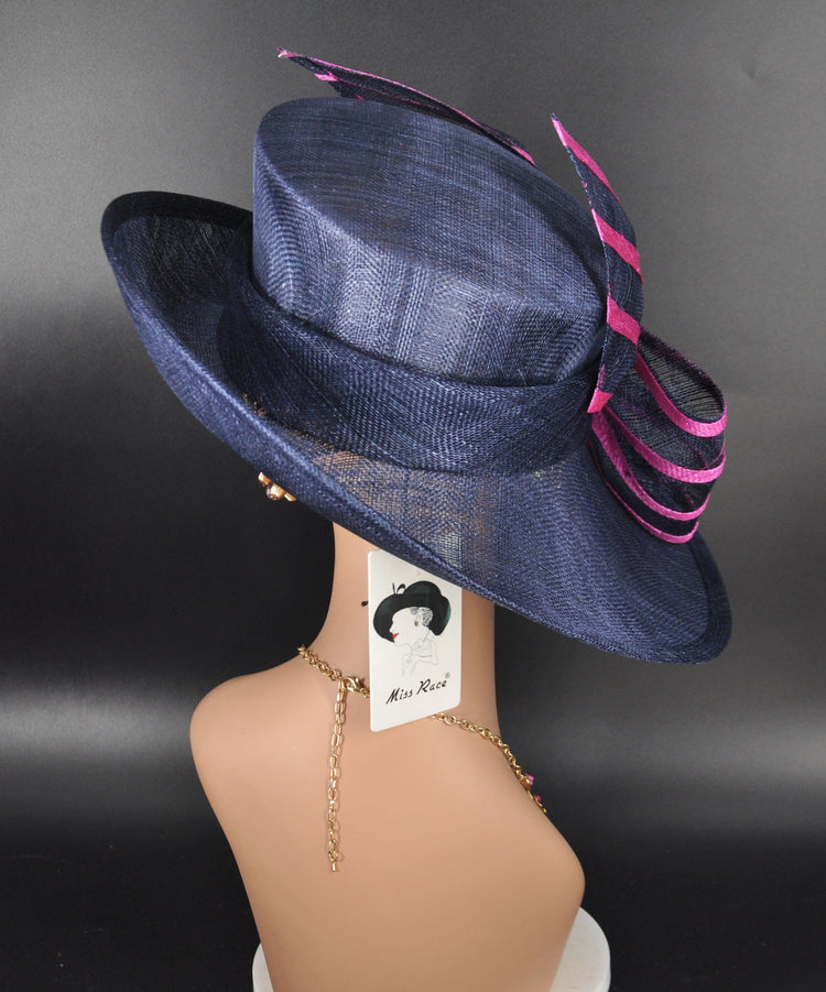 Sinamay Derby Hat: Navy Blue Medium Brim with Fuchsia Bow