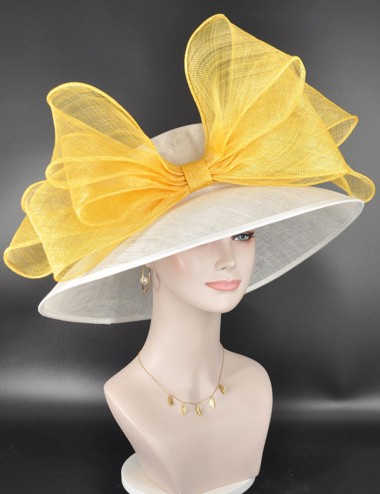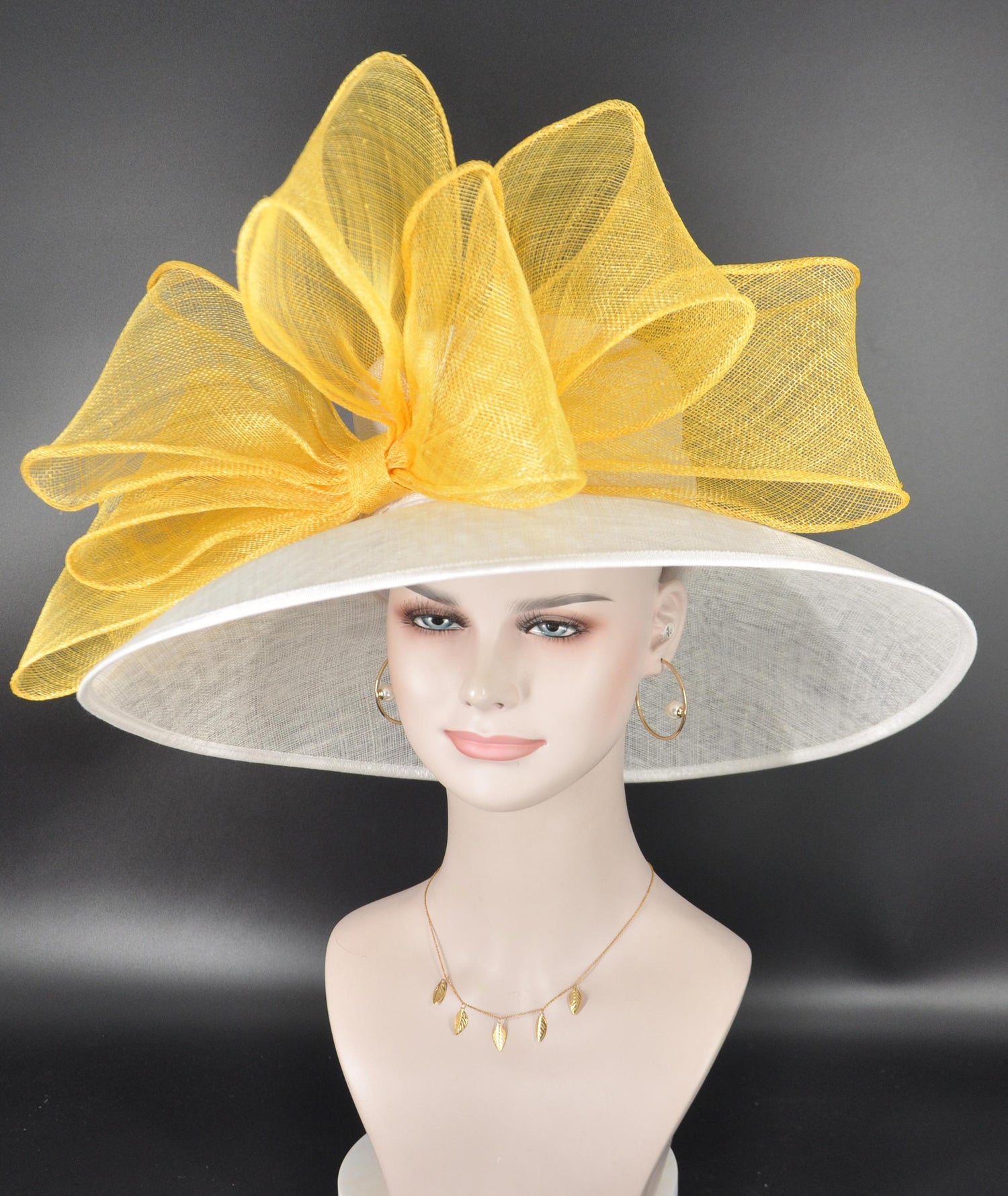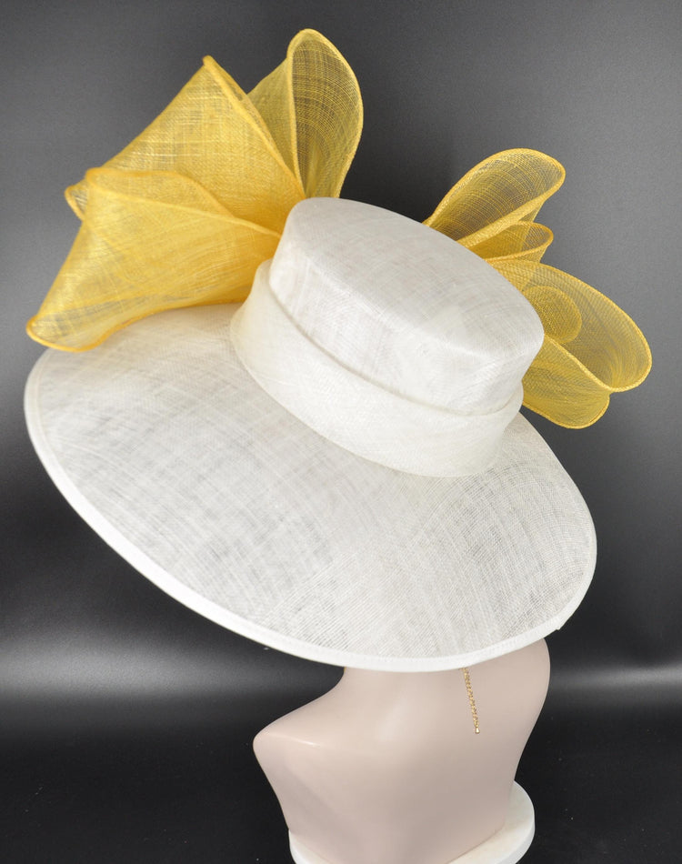 Sinamay Derby Hat: White Wide Brim with Yellow Bow