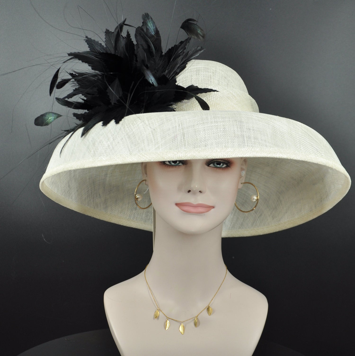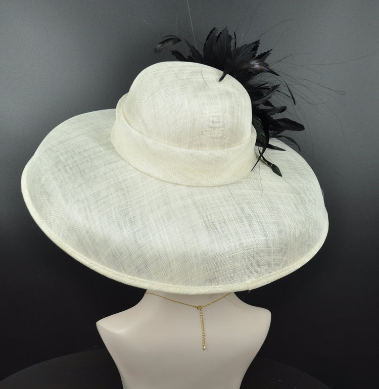 Sinamay Dome Hat: Ivory Wide Brim Kentucky Derby Feather Hat
