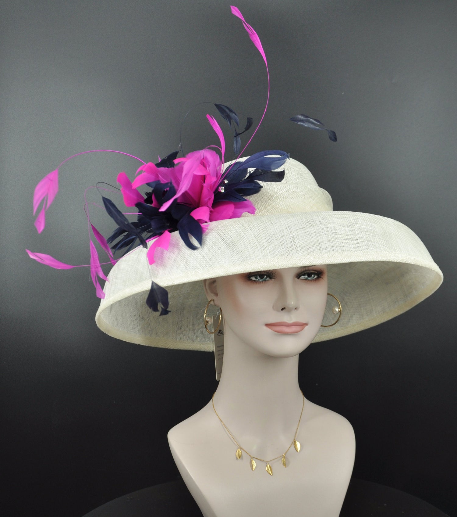 Sinamay Dome Hat: Ivory Wide Brim Kentucky Derby Hat with Feather Flower