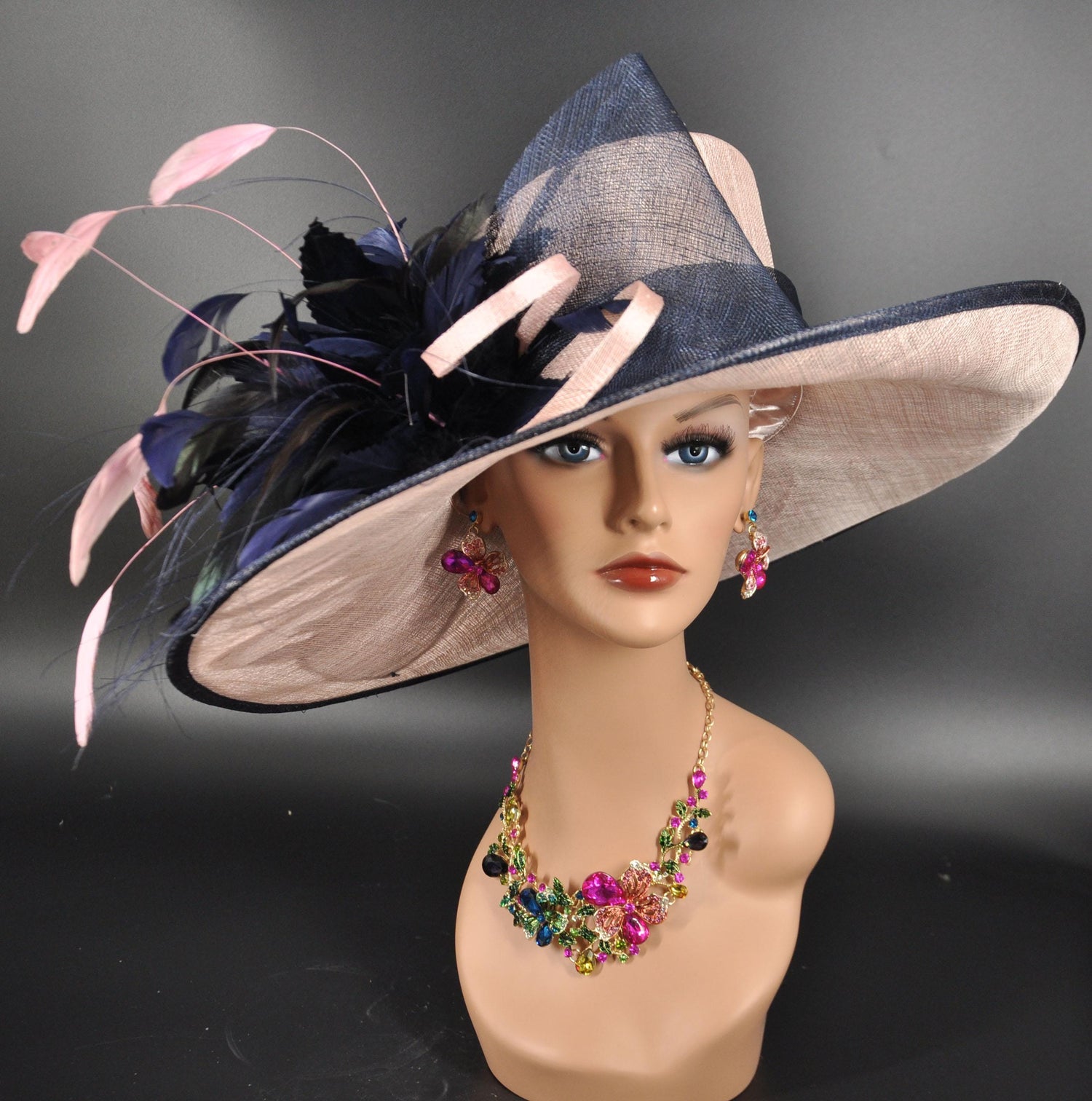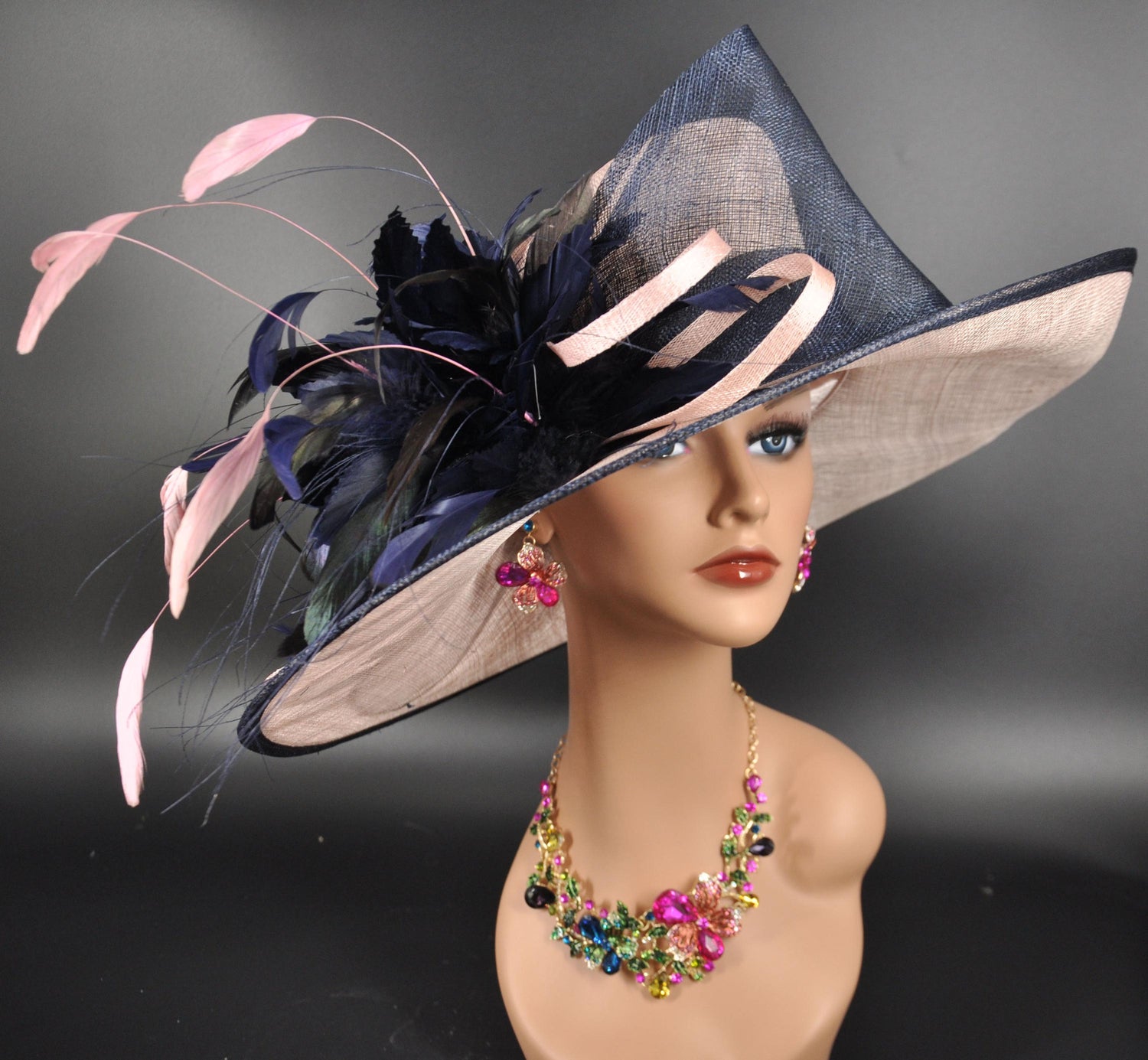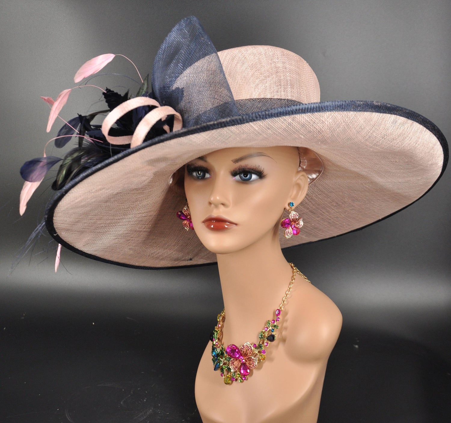 Sinamay Kentucky Derby Hat: Blush Pink, Navy Feather Flower