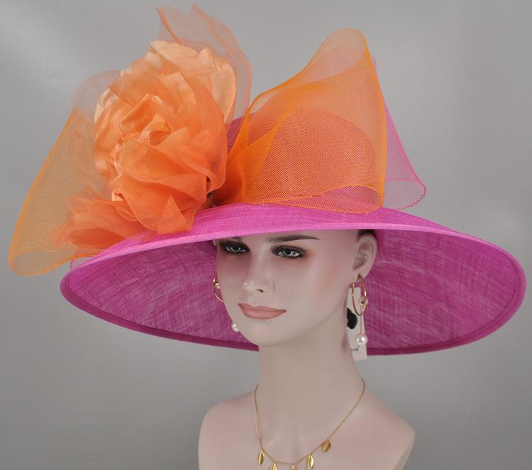 Sinamay Kentucky Derby Hat: Hot Pink Wide Brim with Orange Silk Flower