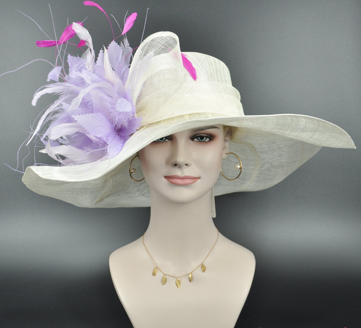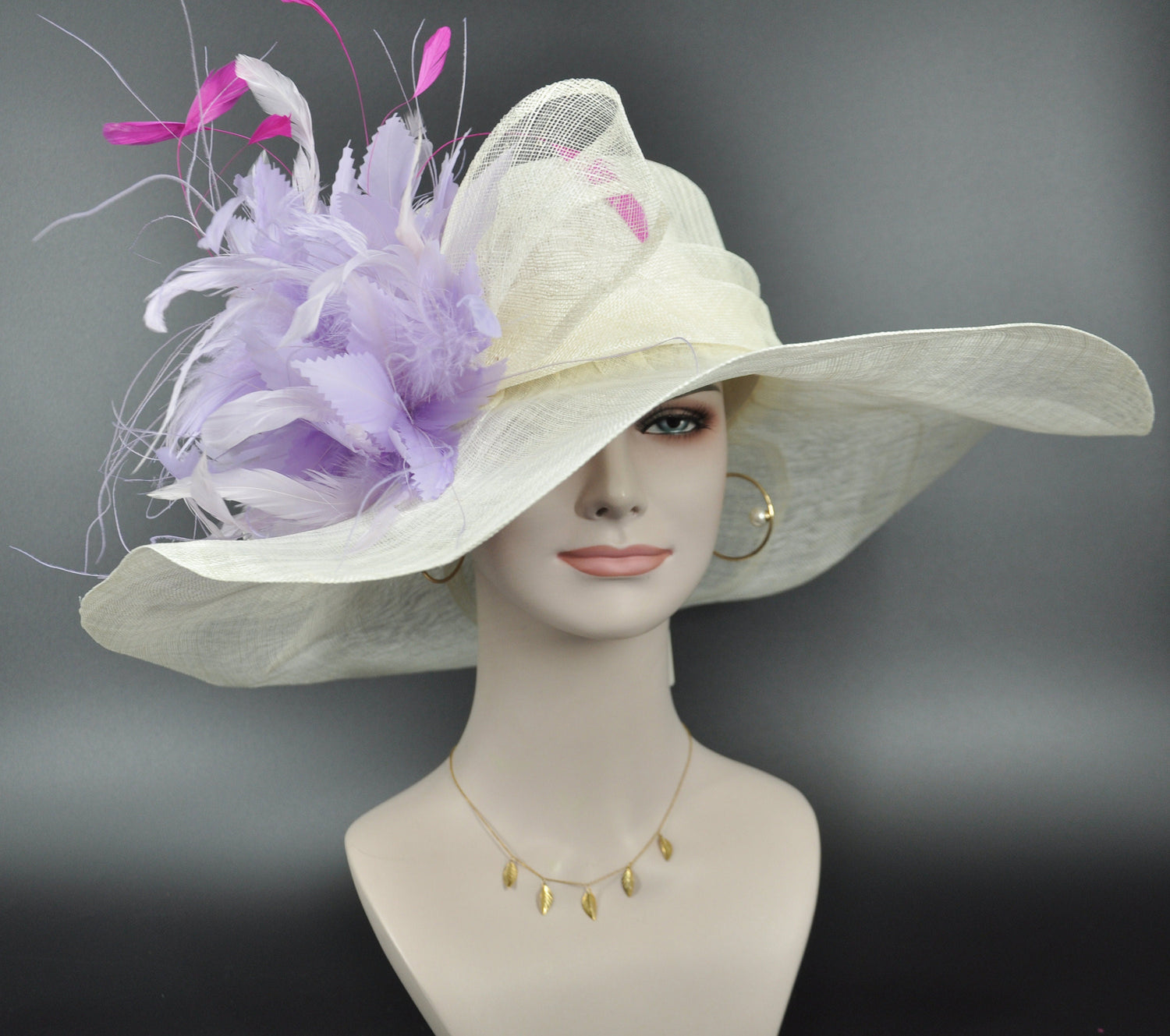 Sinamay Kentucky Derby Hat: Ivory Lavender Feather Church Hat
