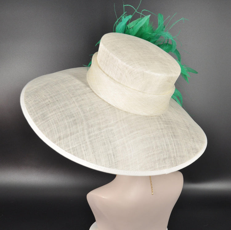 Sinamay Kentucky Derby Hat: Ivory Wide Brim with Green Feather Flower