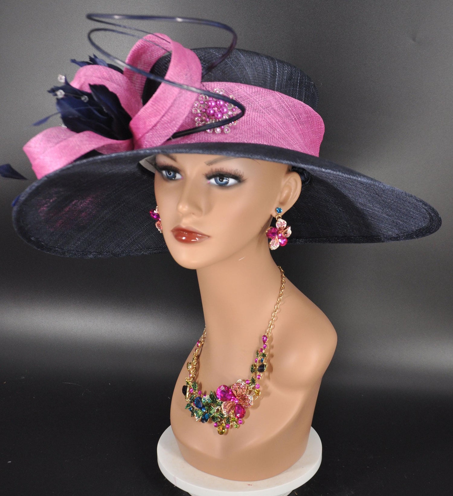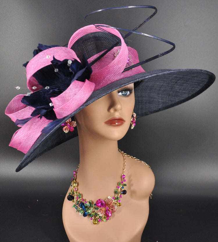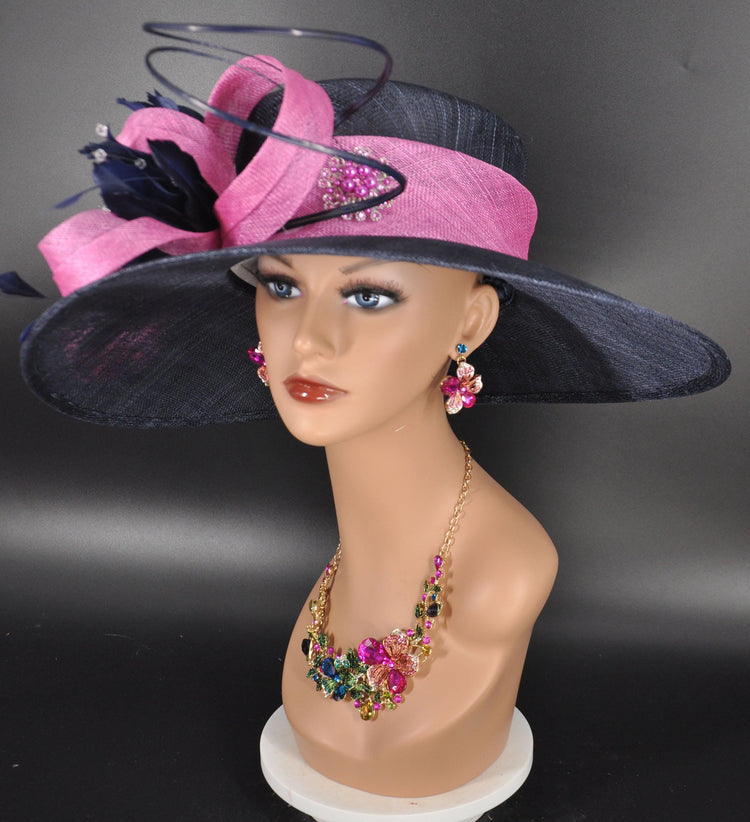 Sinamay Kentucky Derby Hat: Navy Blue Wide Brim with Hot Pink Rhinestones