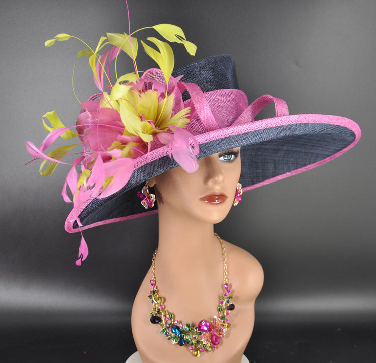 Sinamay Kentucky Derby Hat: Navy, Hot Pink & Lime Green Feather Flower