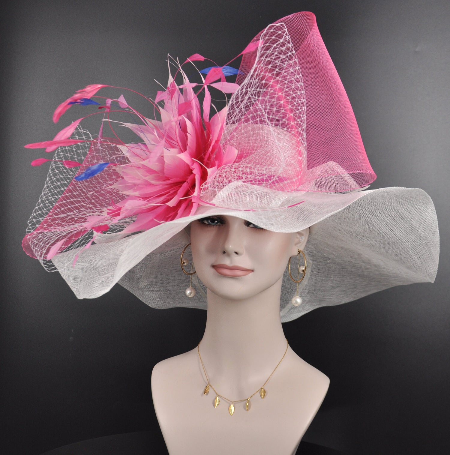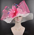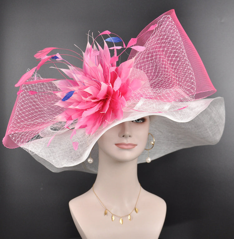 Sinamay Kentucky Derby Hat: White Wide Brim with Pink Feather Flower