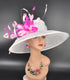 Sinamay Kentucky Derby Hat: White Wide Brim with Pink Feather Flowers