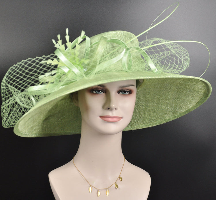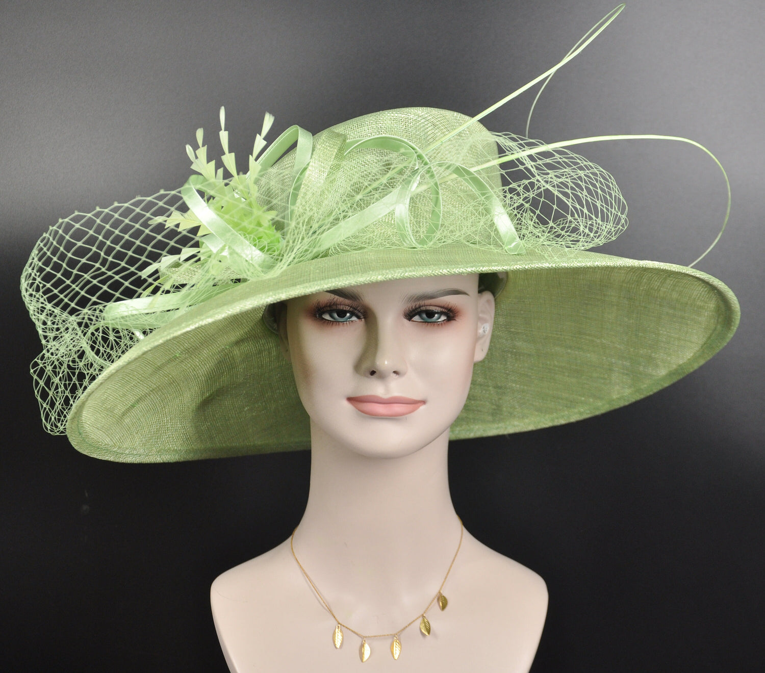 Spring Green Wide Brim Sinamay Derby Hat: Feather Flower Ascot Hat